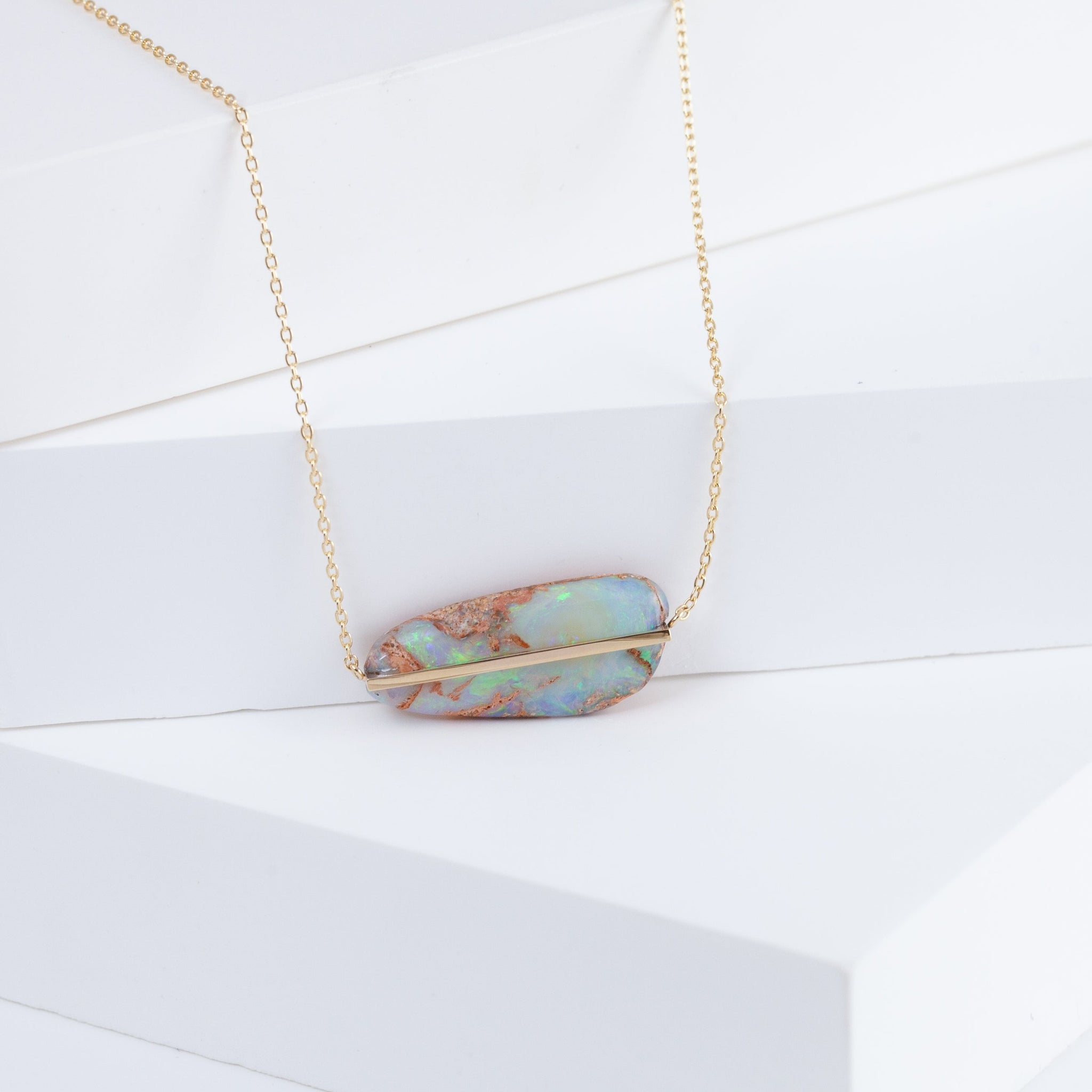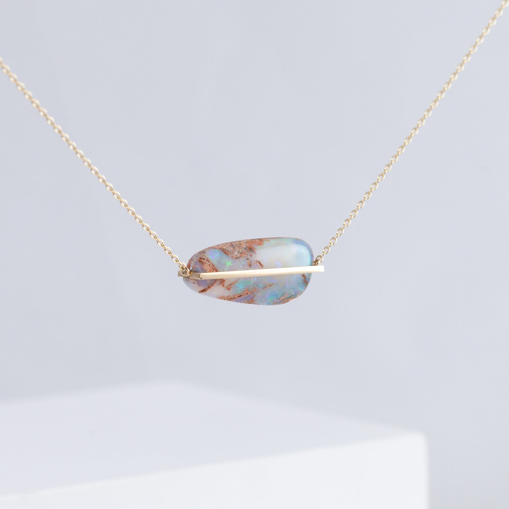10k yellow gold opalized wood necklace, set in Januka's proprietary band setting. One-of-a-kind in shape and color. Each opalized wood has its unique shape, pattern and color, making it truly a natural piece of art. This necklace has a silicon adjuster at the back which allows you to shorten it to the length you desire to fit your look of the day.