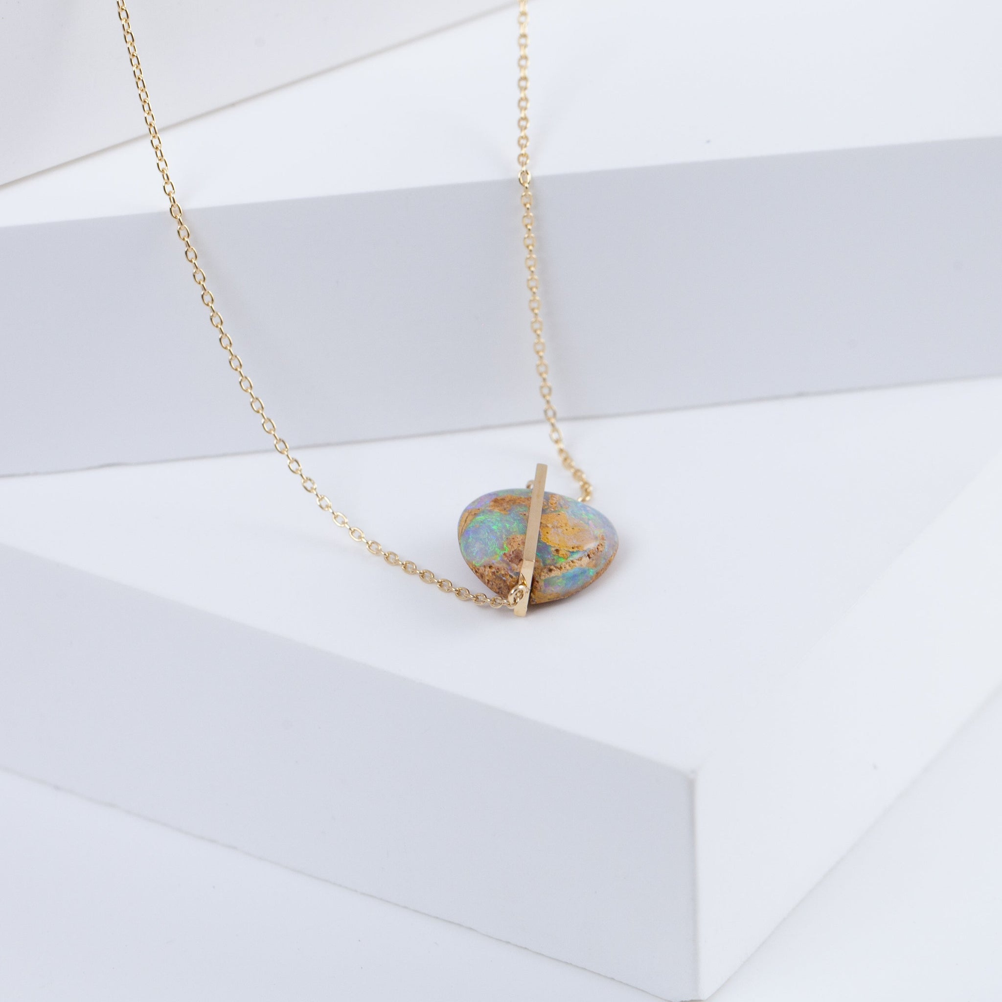 10k yellow gold opalized wood necklace, set in Januka's proprietary band setting. One-of-a-kind in shape and color. Each opalized wood has its unique shape, pattern and color, making it truly a natural piece of art. This necklace has a silicon adjuster at the back which allows you to shorten it to the length you desire to fit your look of the day.