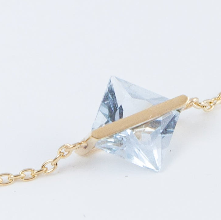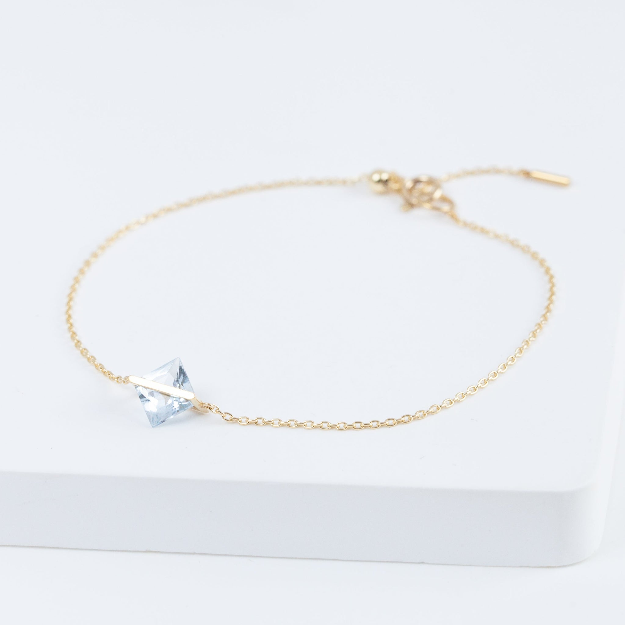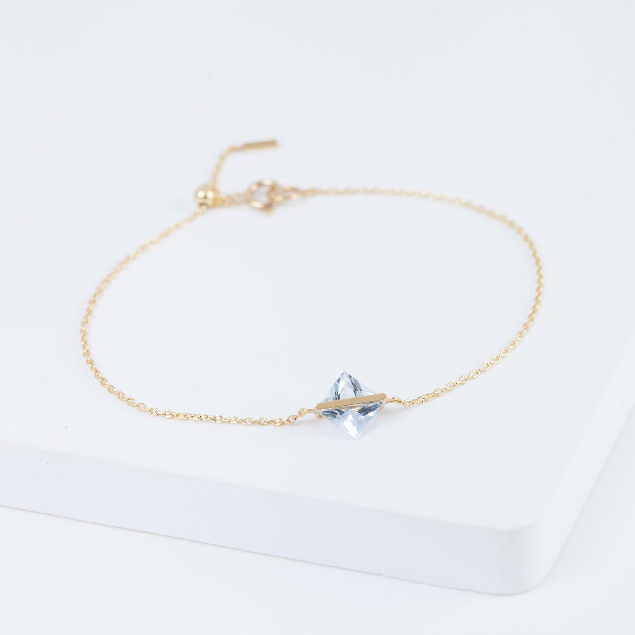 10k yellow gold aquamarine bracelet, set in Januka's proprietary band setting. One-of-a-kind in shape and color. This bracelet has a silicon adjuster at the back which allows you to shorten it to the length you desire to fit your look of the day.