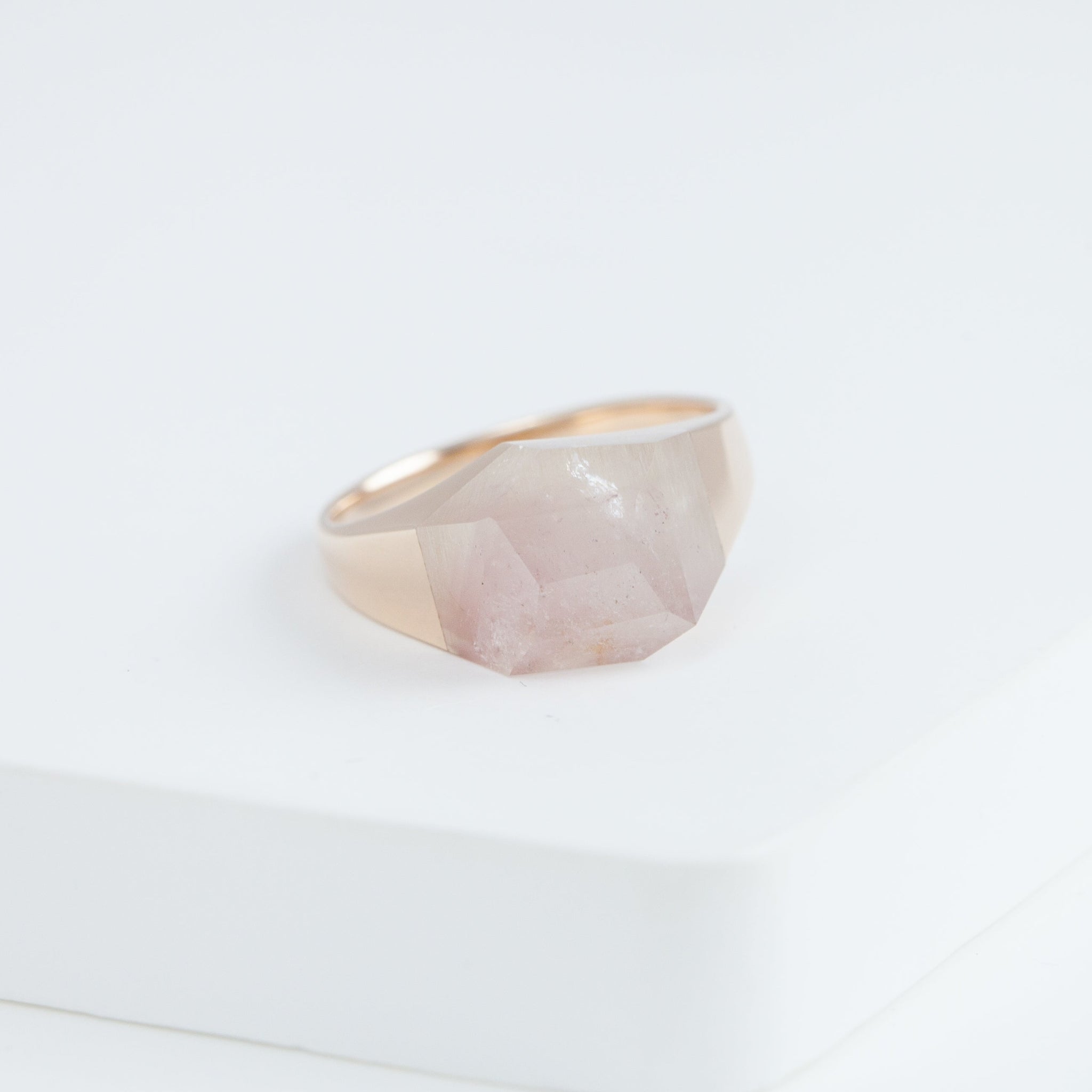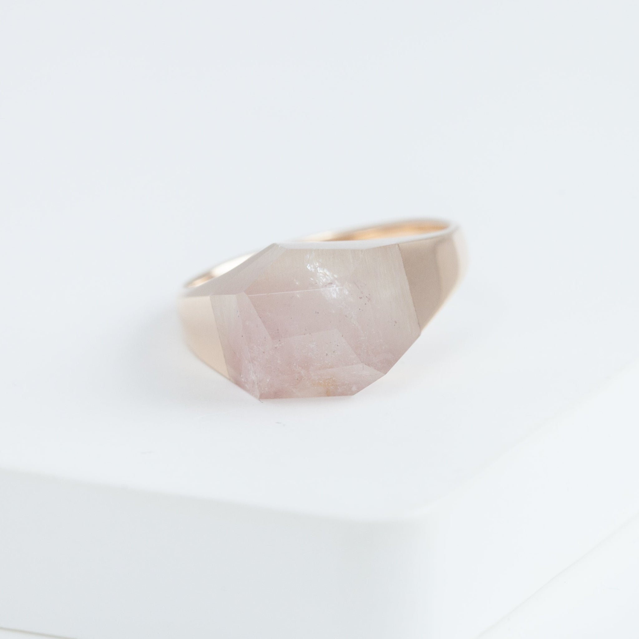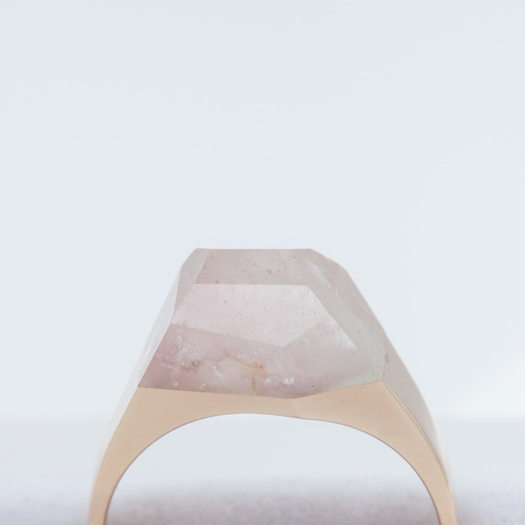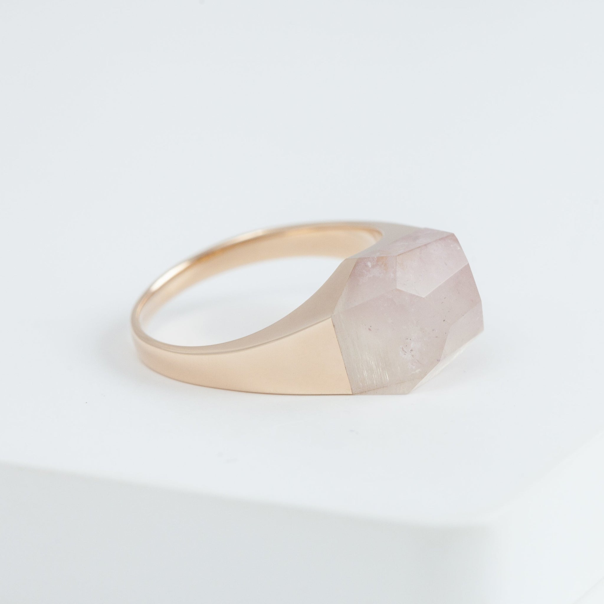 Bororo's signature rock ring in a smaller size with a beautiful lithium in quartz. Mini rock rings are perfect for those who love the innovative design of rock rings and want to wear it every day. The irregular geometrical cut of the stone makes this ring edgy and contemporary. Rose gold plating is a new addition to the rock series that soften the tone of the ring and makes it even gentler. This one-of-a-kind lithium in quartz reminds us of the Sakura season in Japan.