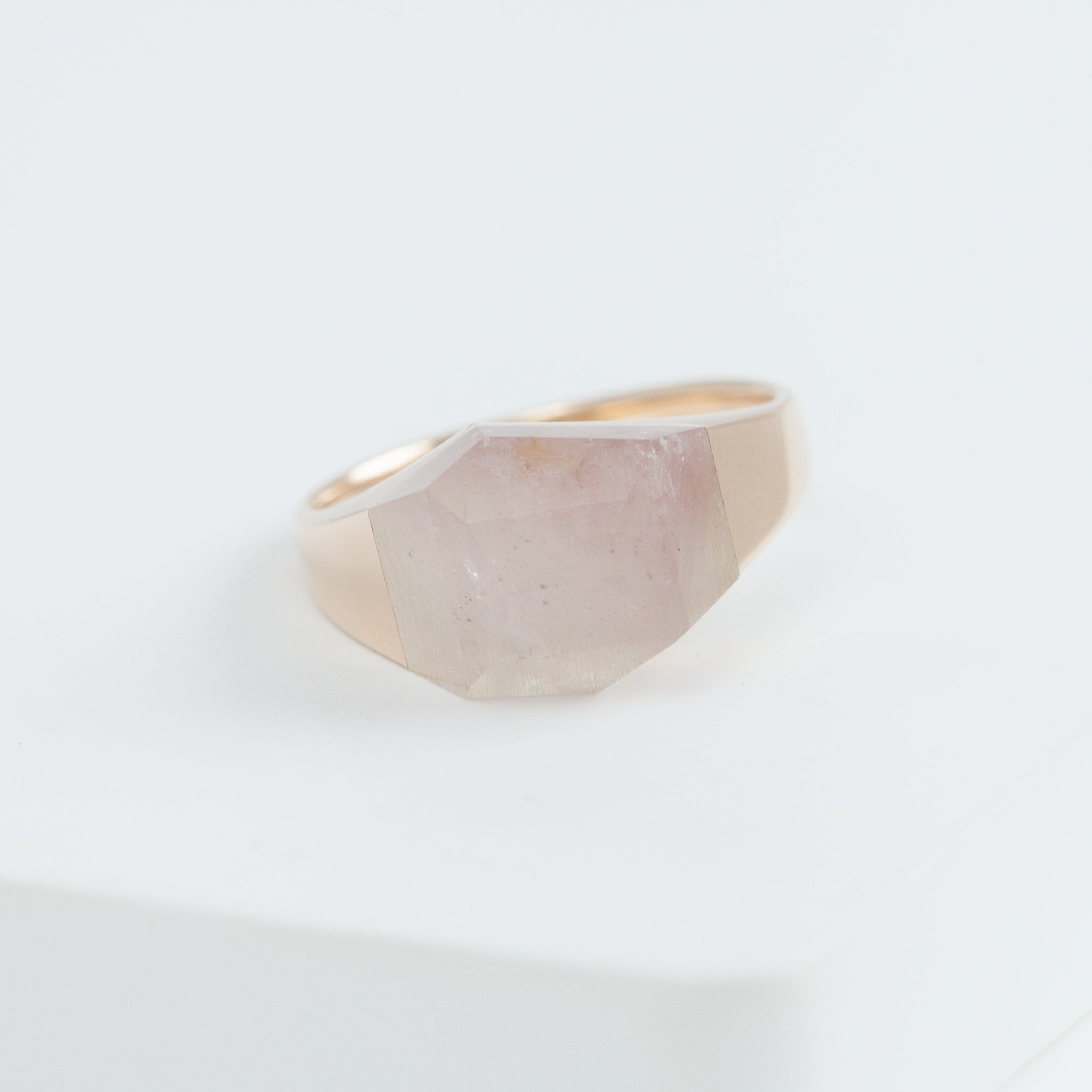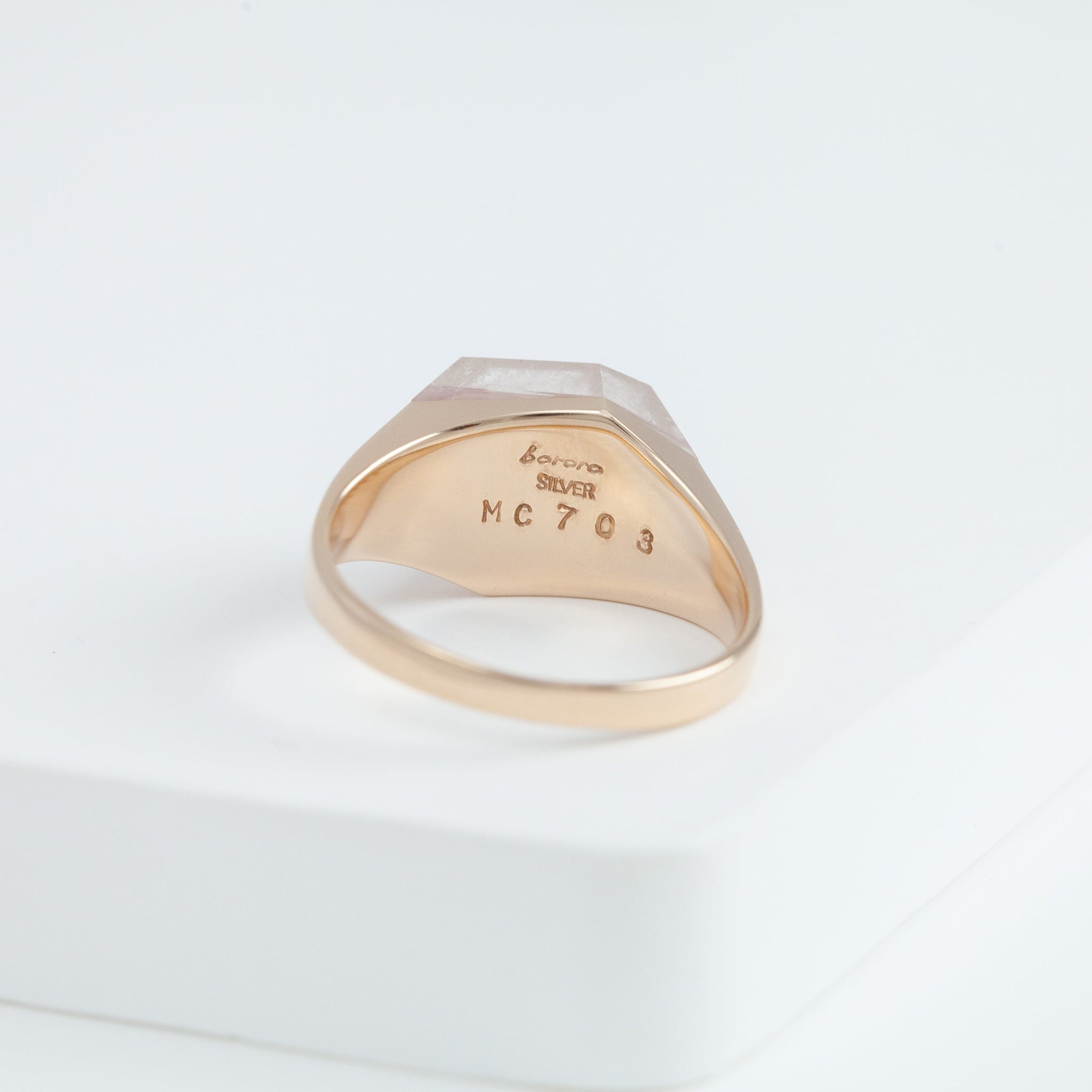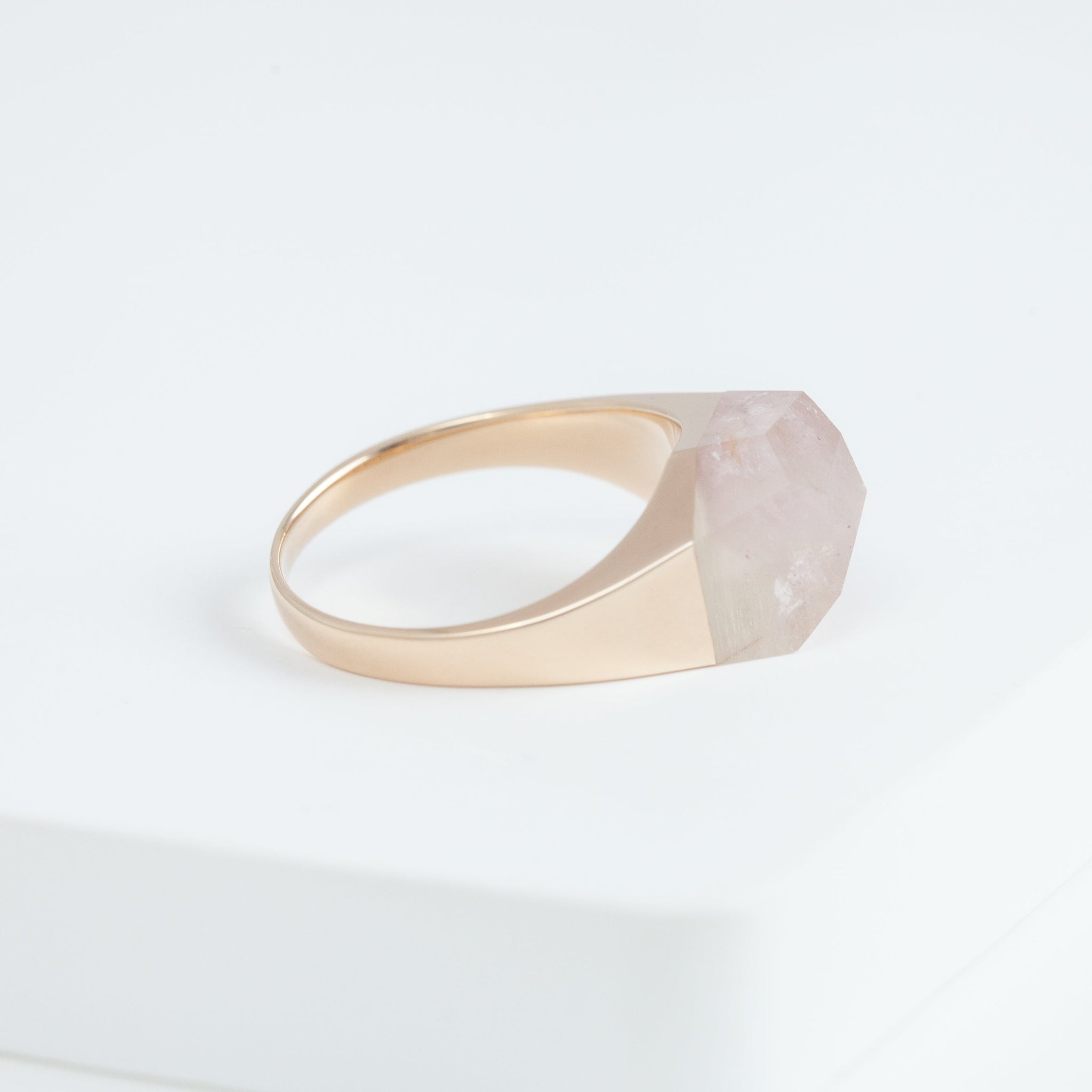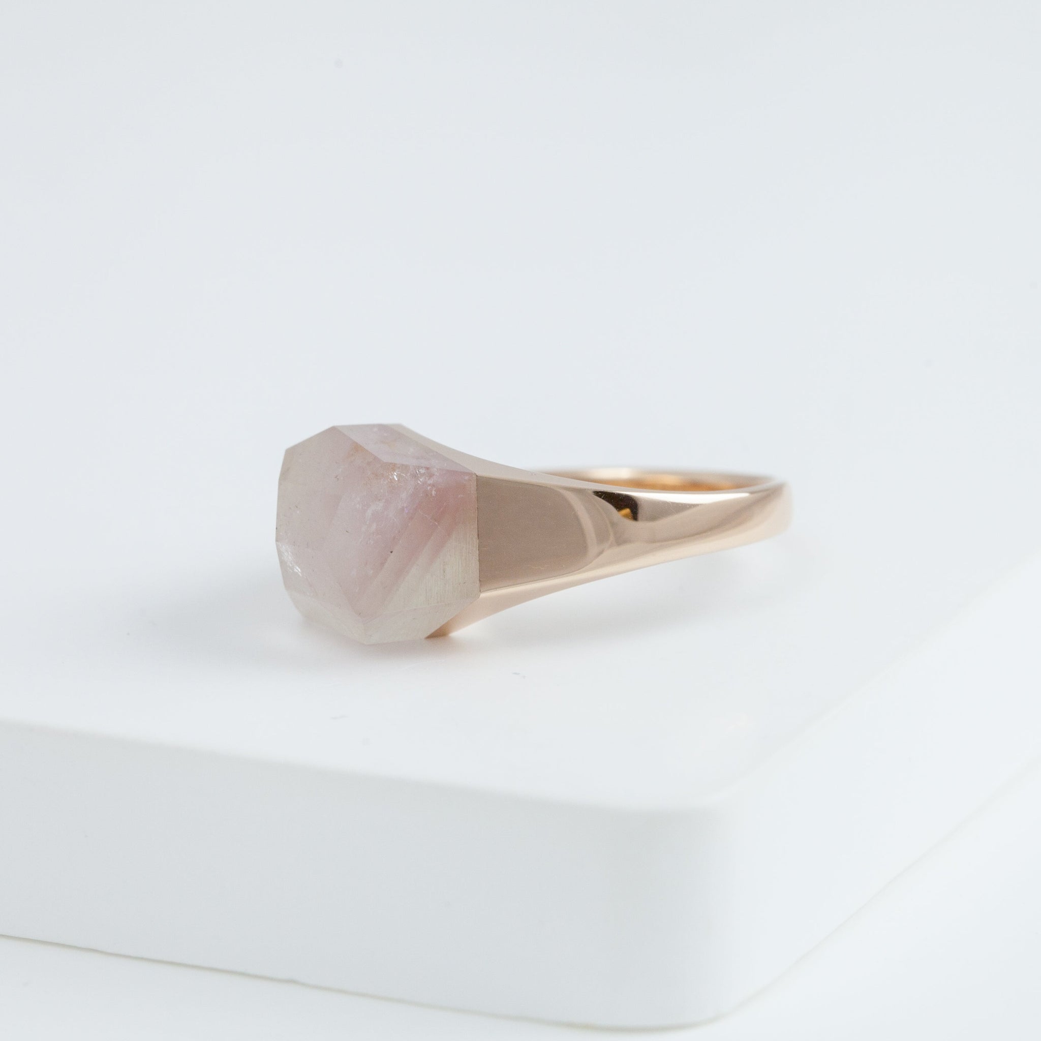 Bororo's signature rock ring in a smaller size with a beautiful lithium in quartz. Mini rock rings are perfect for those who love the innovative design of rock rings and want to wear it every day. The irregular geometrical cut of the stone makes this ring edgy and contemporary. Rose gold plating is a new addition to the rock series that soften the tone of the ring and makes it even gentler. This one-of-a-kind lithium in quartz reminds us of the Sakura season in Japan.