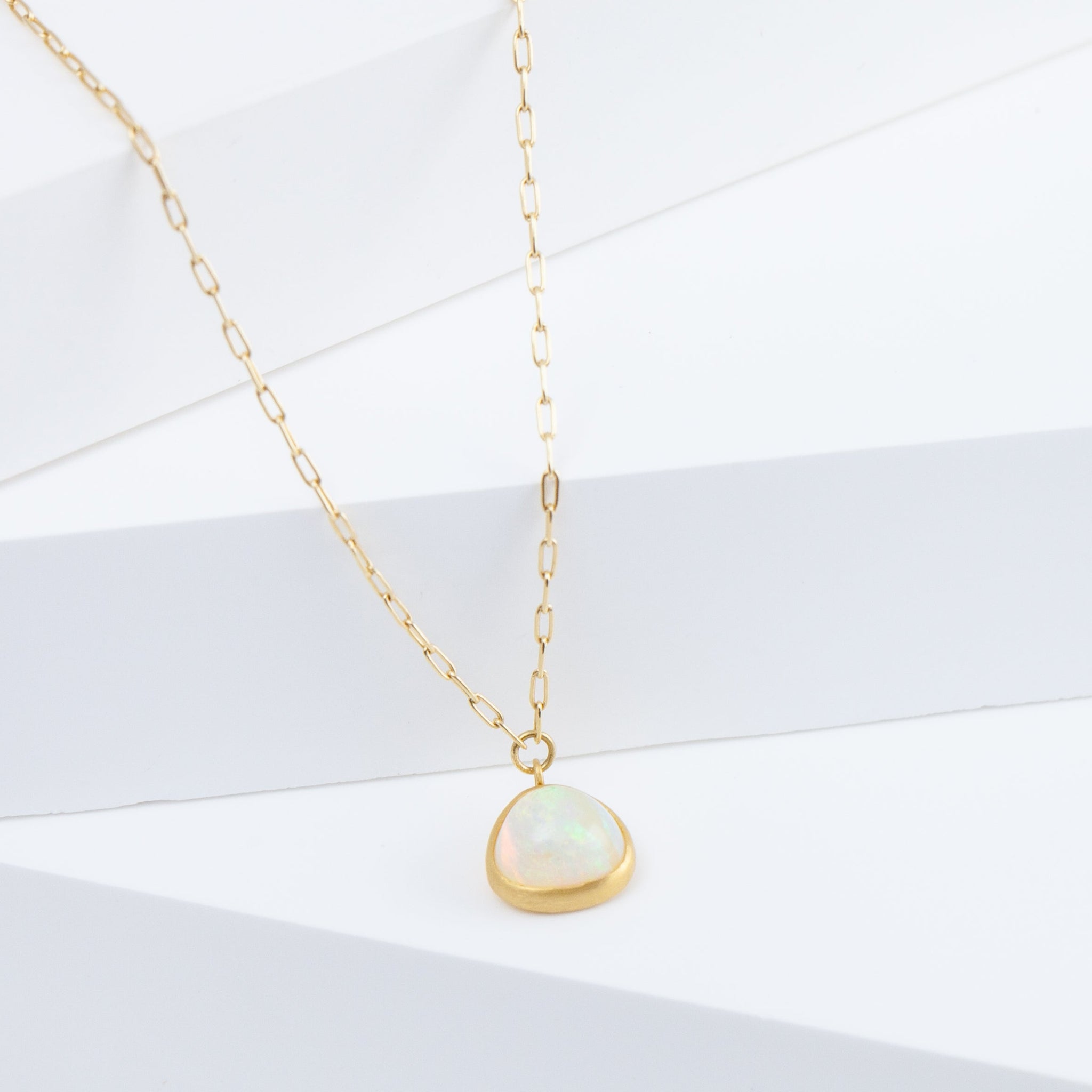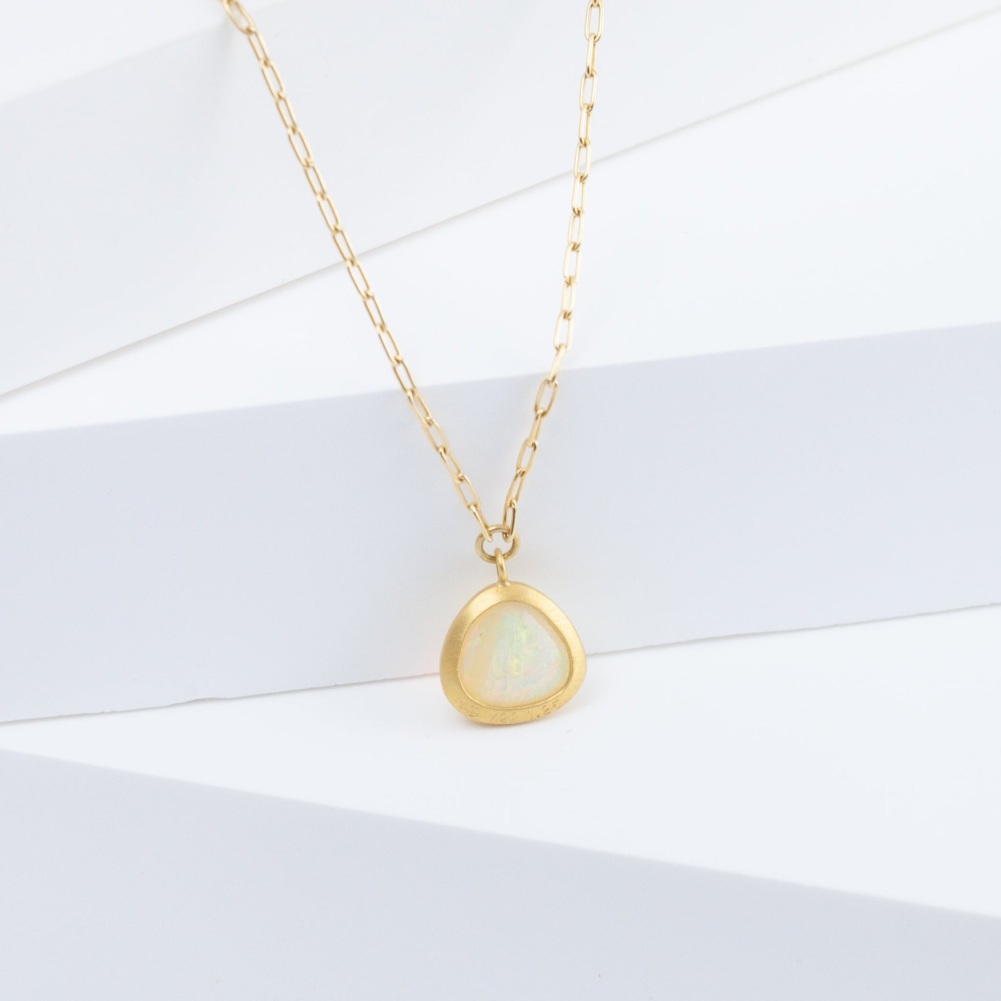 18k yellow gold necklace with a one-of-a-kind crystal opal as its pendant. The gentle crystal opal has one-of-a-kind rainbow and fire making it subtle, yet eye-catching at the same time.