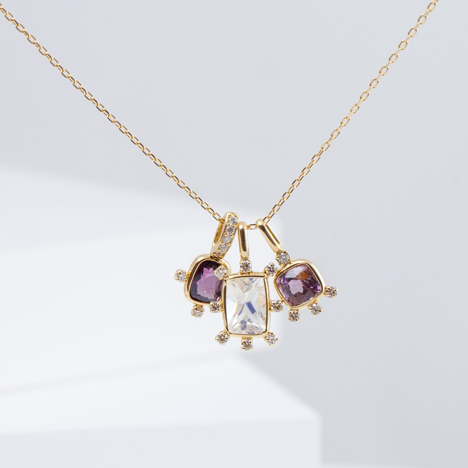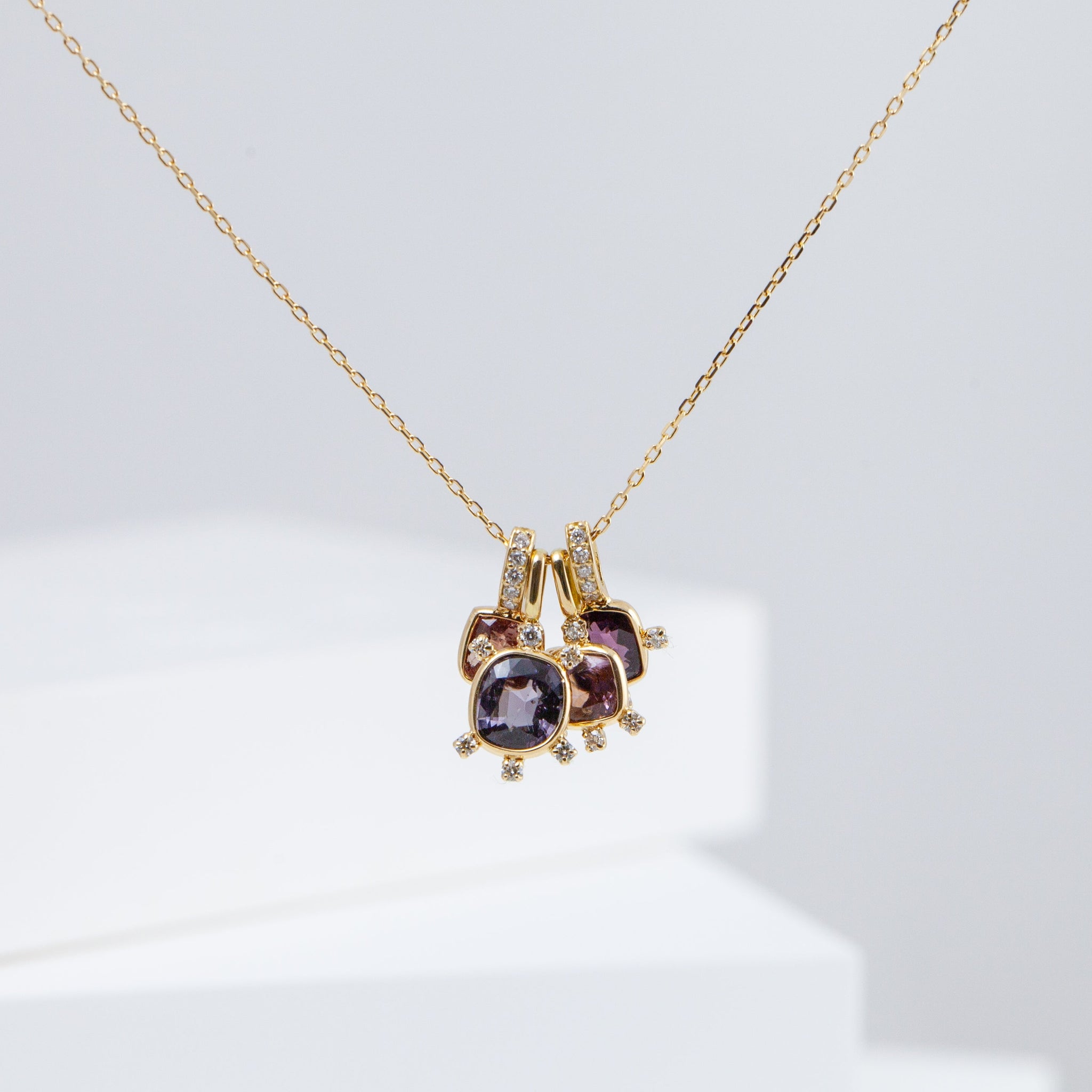 Tiny 18k yellow gold necklace with a gorgeous one-of-a-kind purple spinel decorated with tiny diamonds. The pendant is detachable from the chain, so wear this pendant alone, stack with other Tiny pendants, or with your favorite necklaces, have fun coordinating your jewelry of the day!