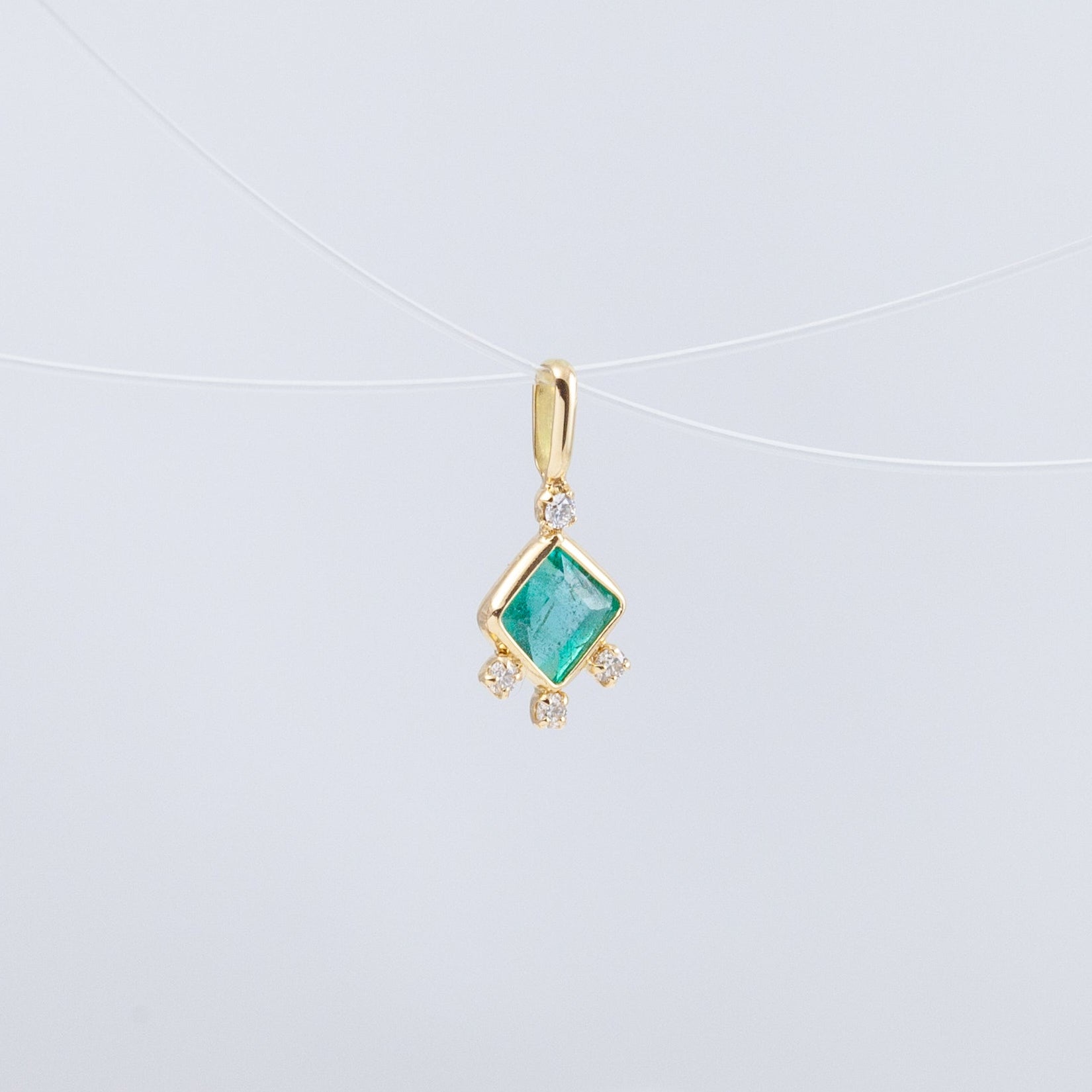 Tiny 18k yellow gold necklace with a gorgeous one-of-a-kind emerald decorated with tiny diamonds. The pendant is detachable from the chain, so wear this pendant alone, stack with other Tiny pendants, or with your favorite necklaces, have fun coordinating your jewelry of the day!