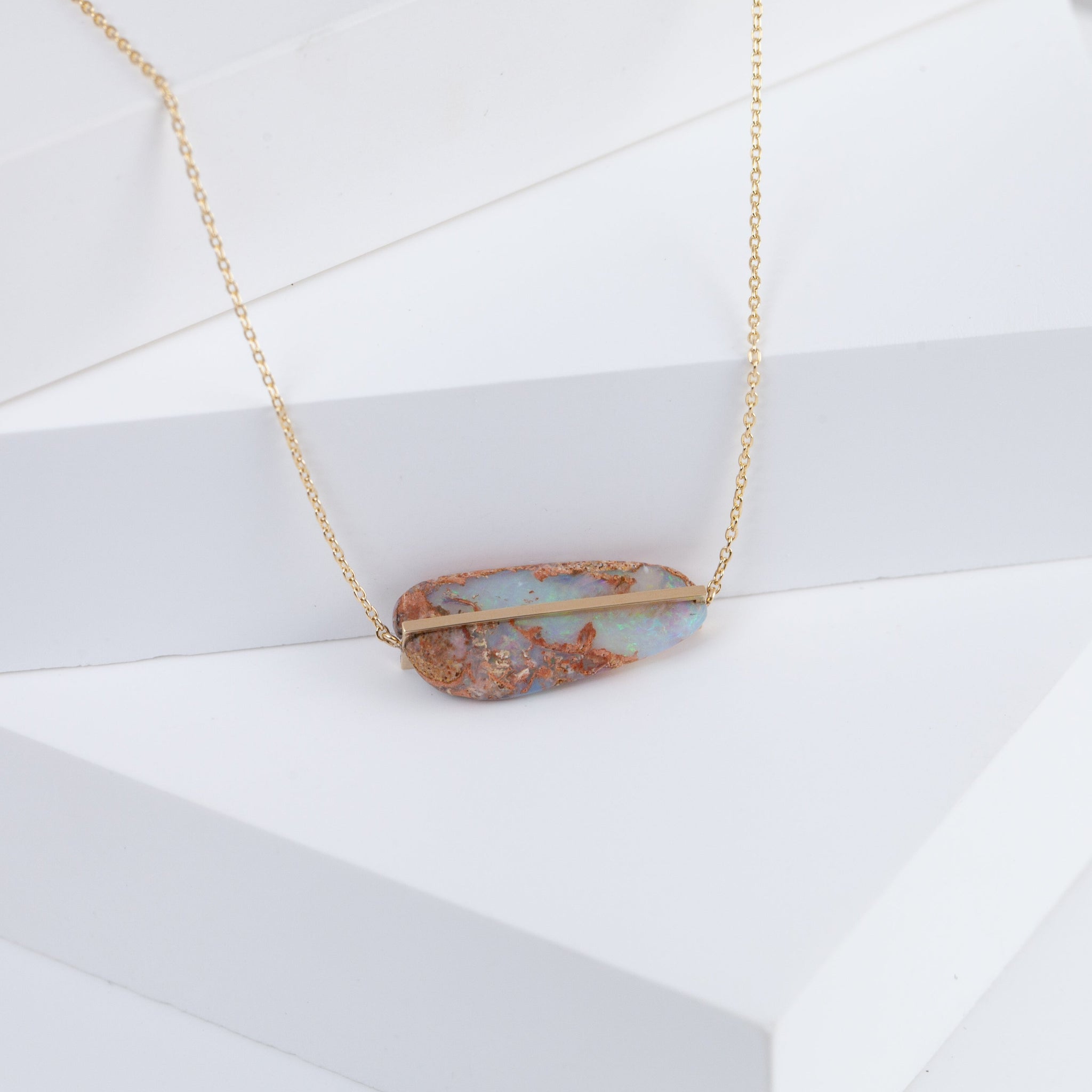 10k yellow gold opalized wood necklace, set in Januka's proprietary band setting. One-of-a-kind in shape and color. Each opalized wood has its unique shape, pattern and color, making it truly a natural piece of art. This necklace has a silicon adjuster at the back which allows you to shorten it to the length you desire to fit your look of the day.
