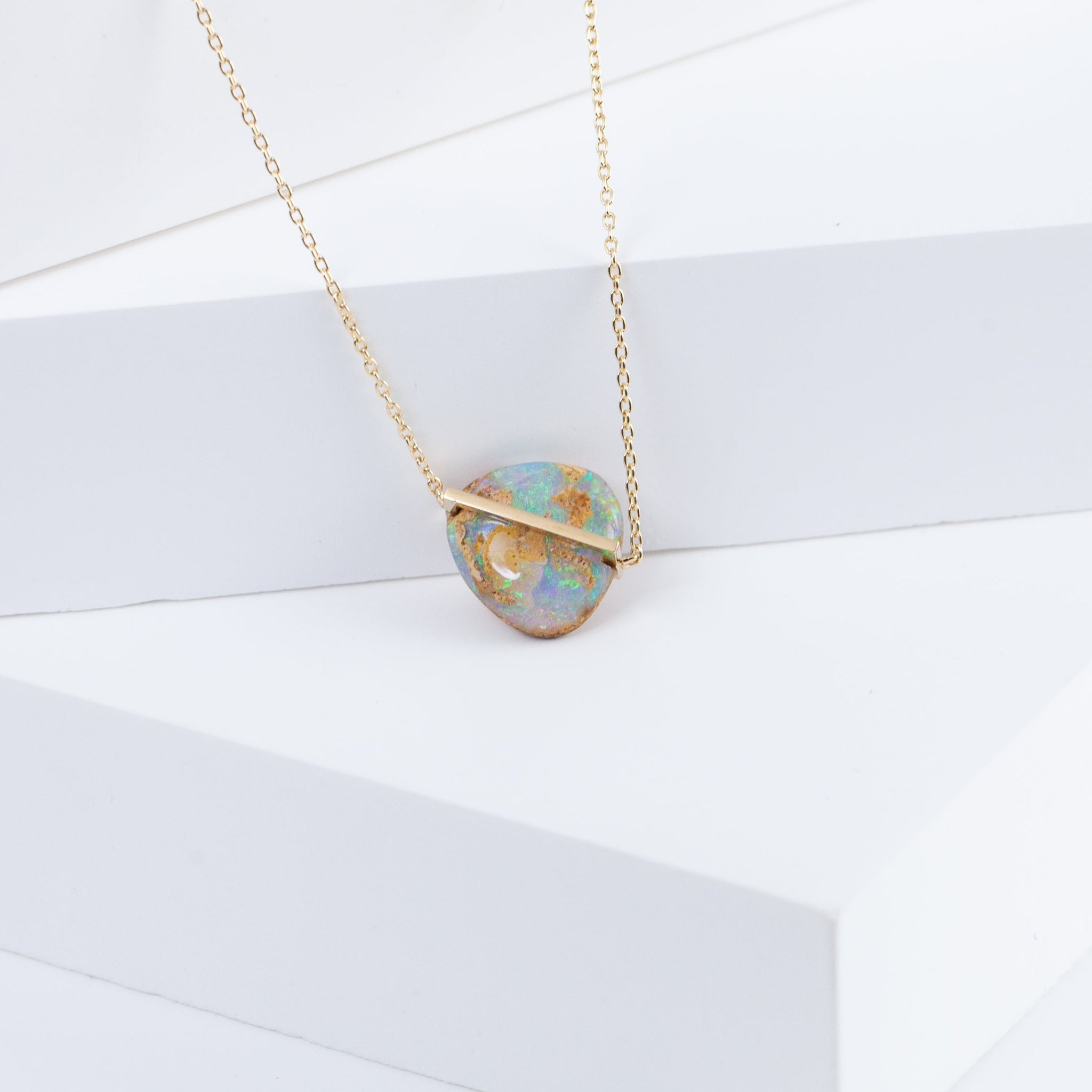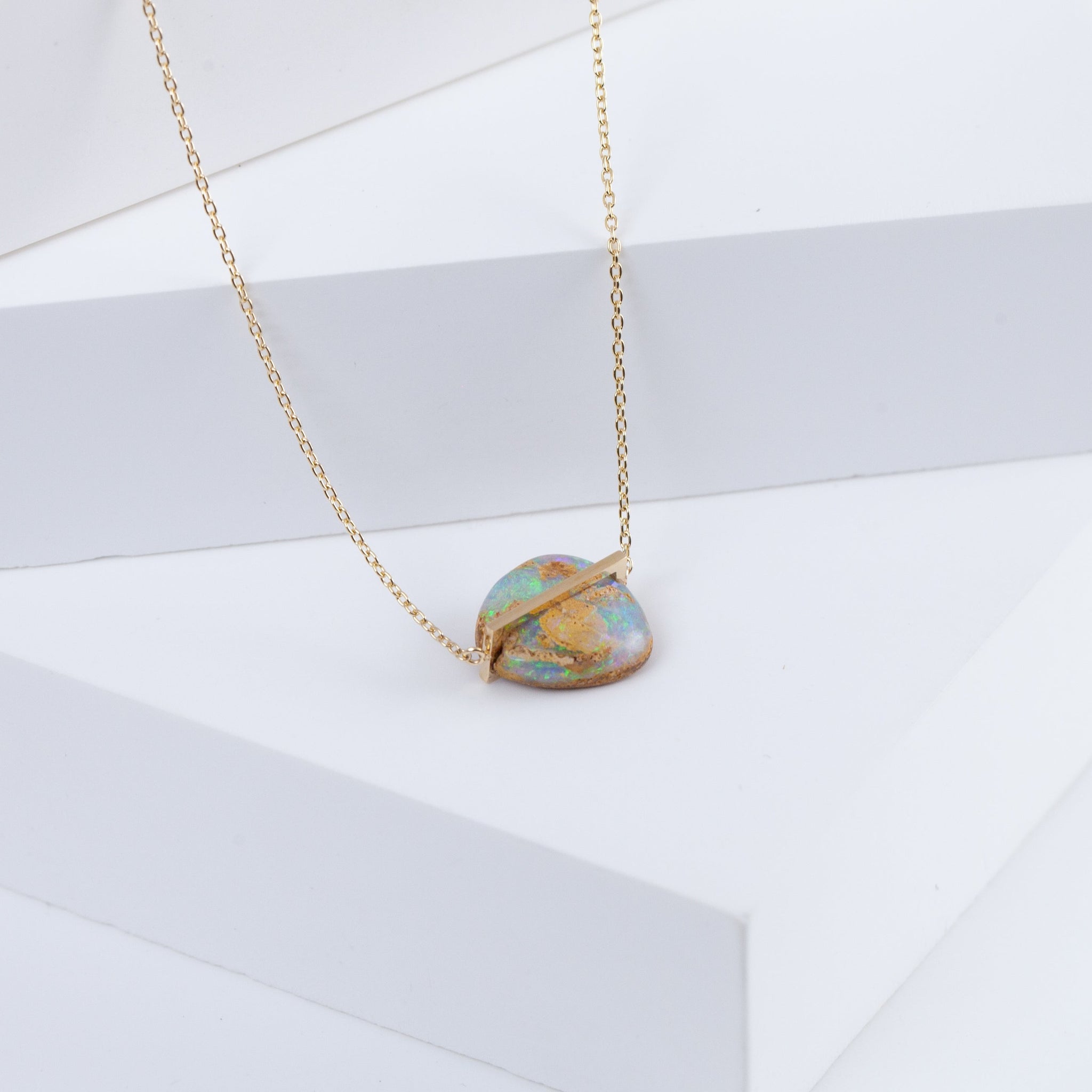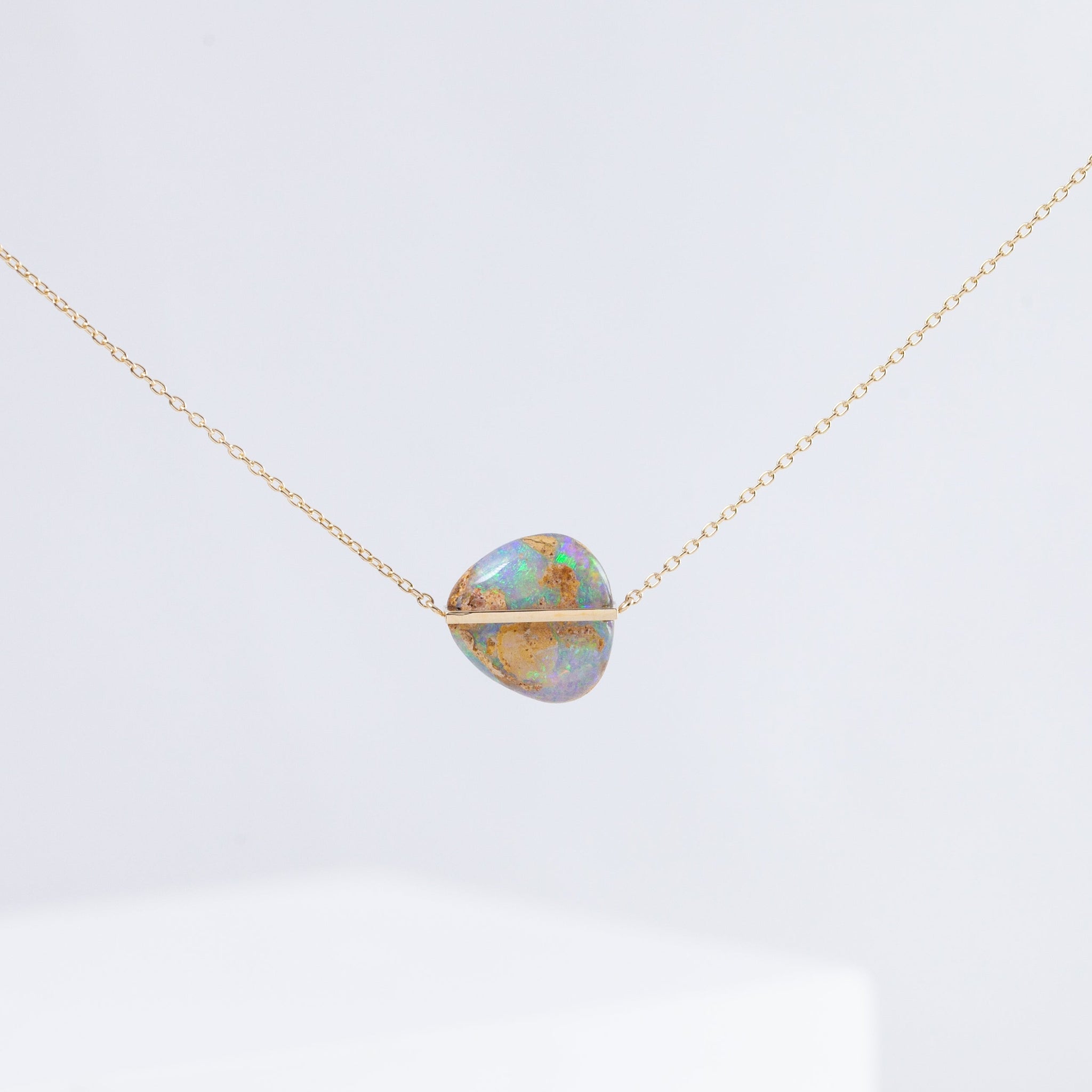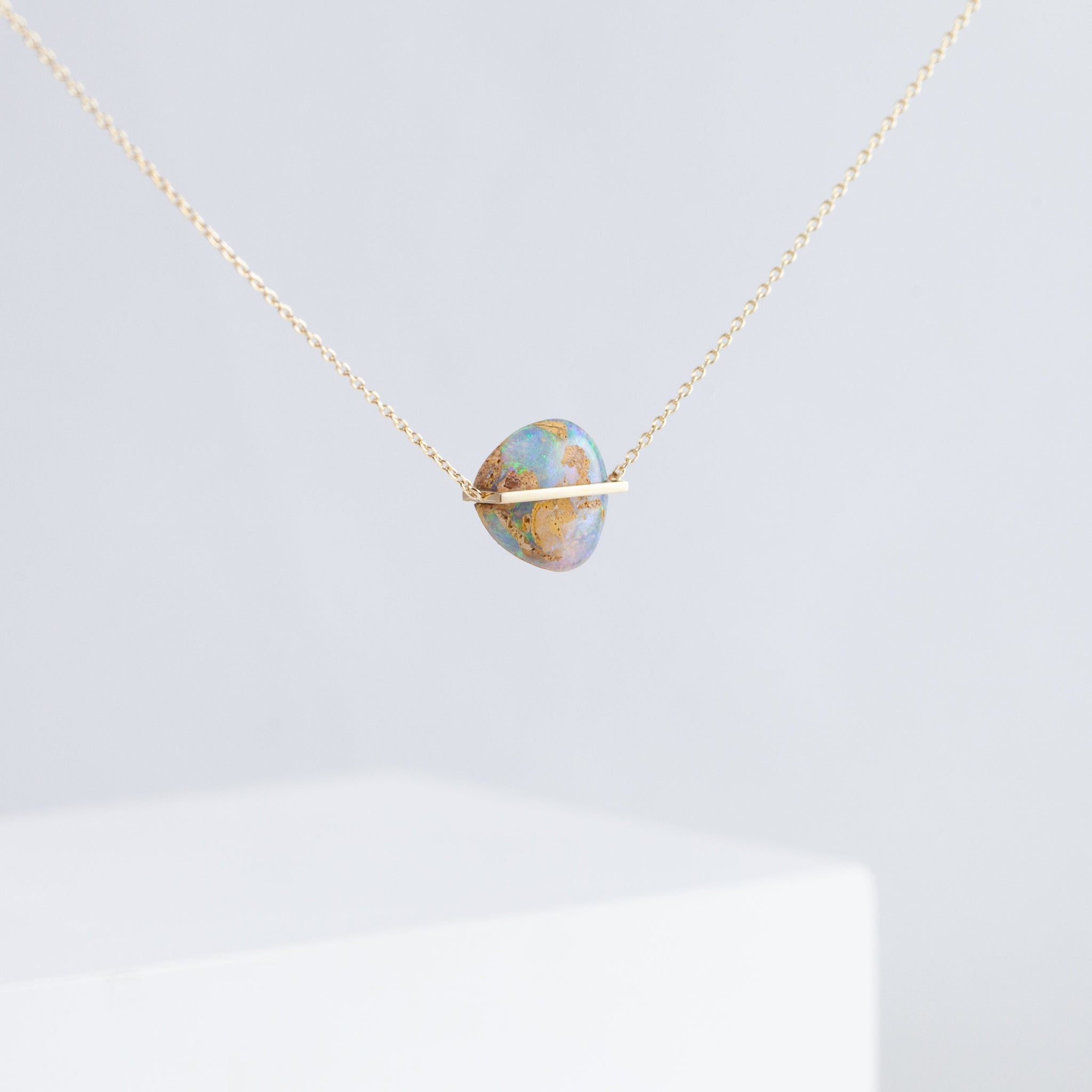 10k yellow gold opalized wood necklace, set in Januka's proprietary band setting. One-of-a-kind in shape and color. Each opalized wood has its unique shape, pattern and color, making it truly a natural piece of art. This necklace has a silicon adjuster at the back which allows you to shorten it to the length you desire to fit your look of the day.
