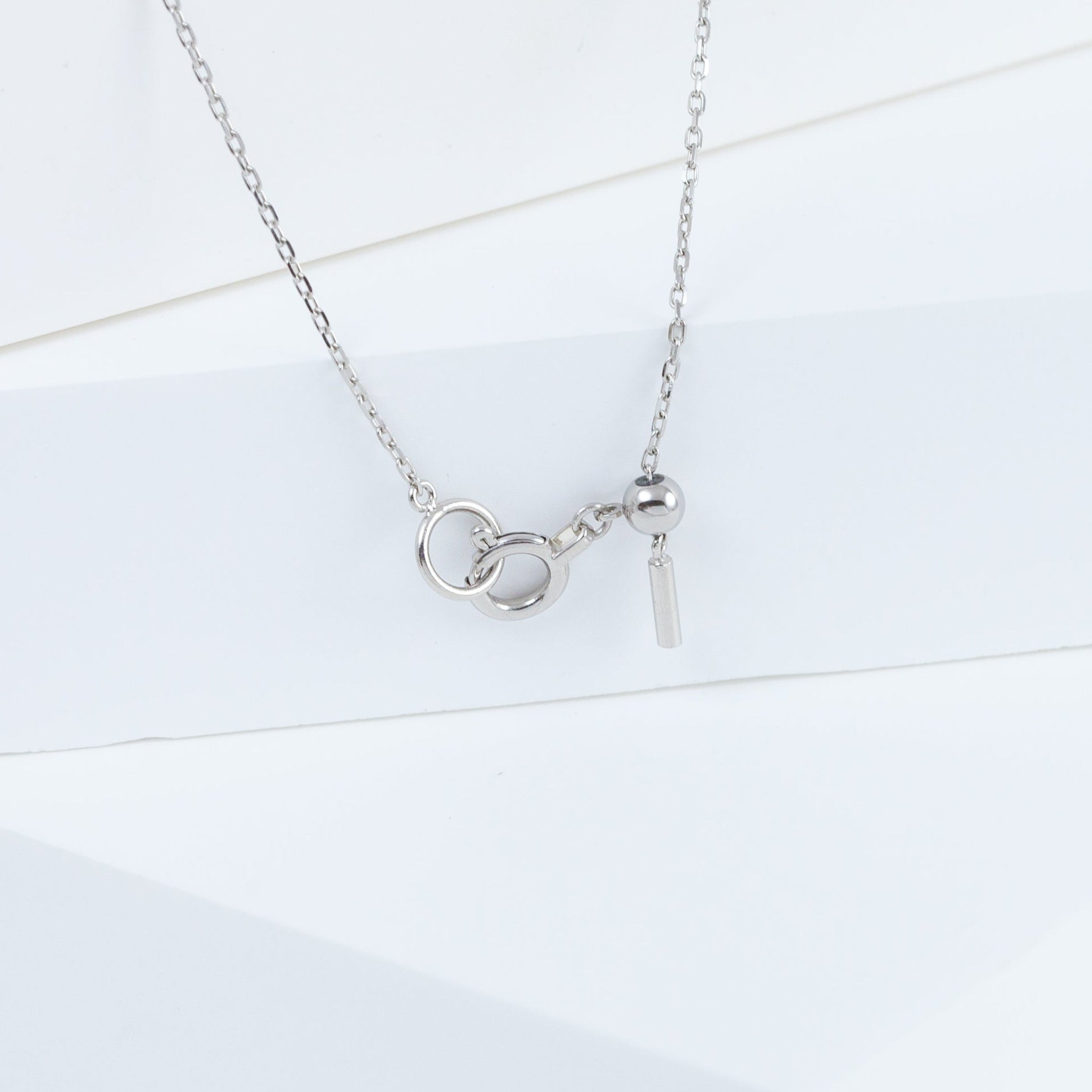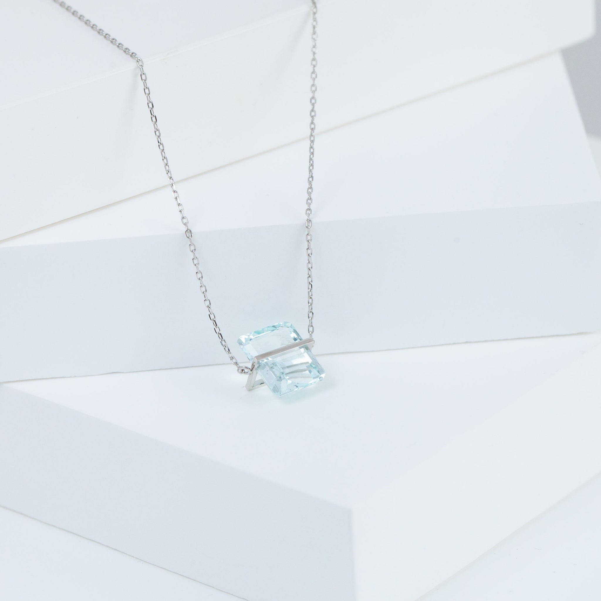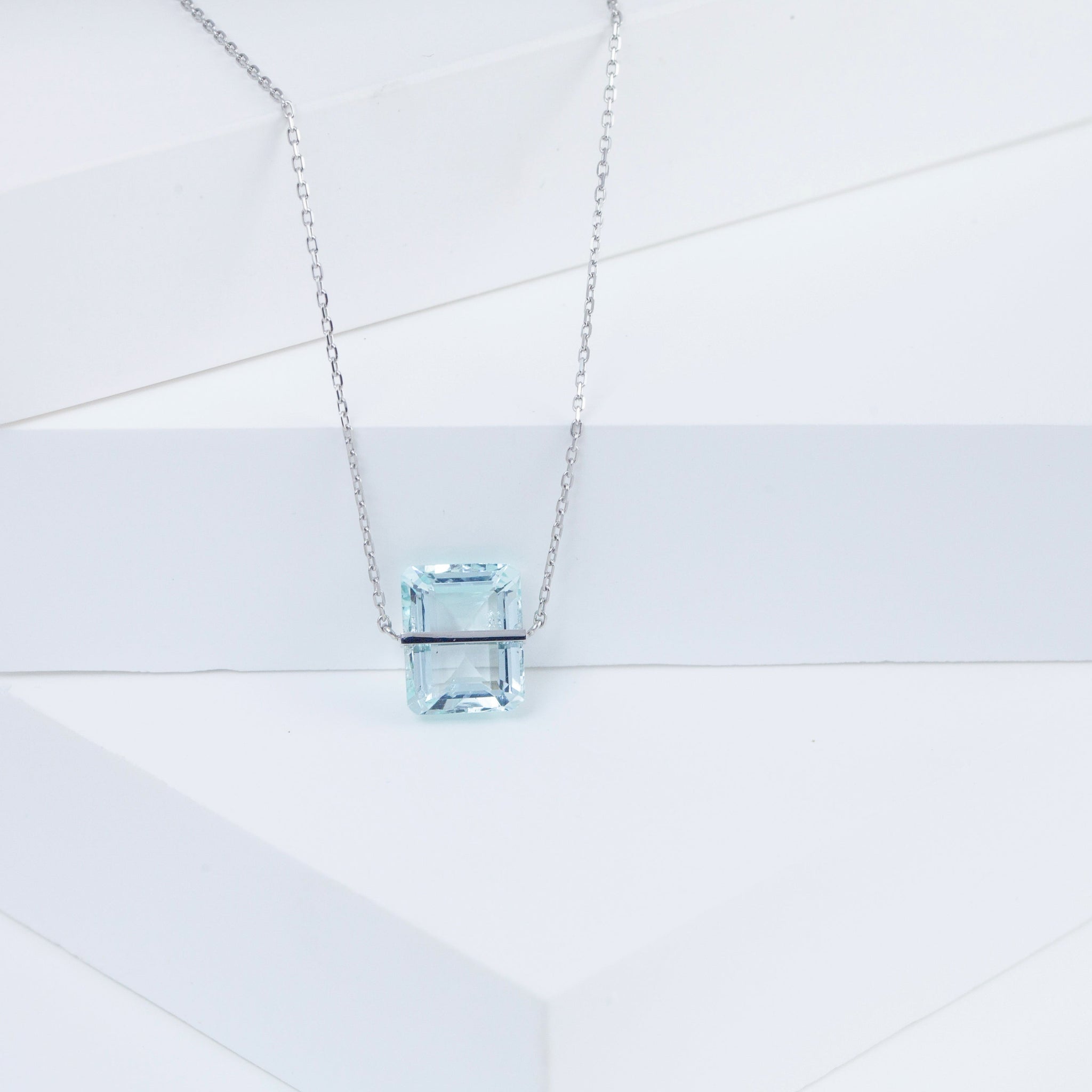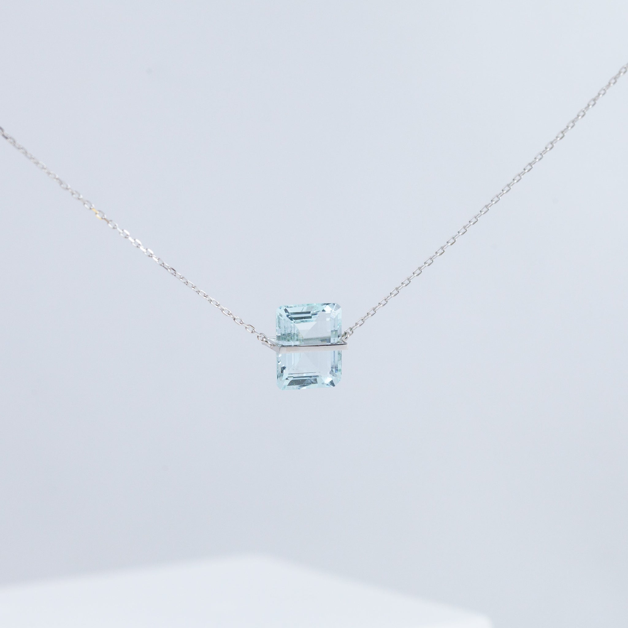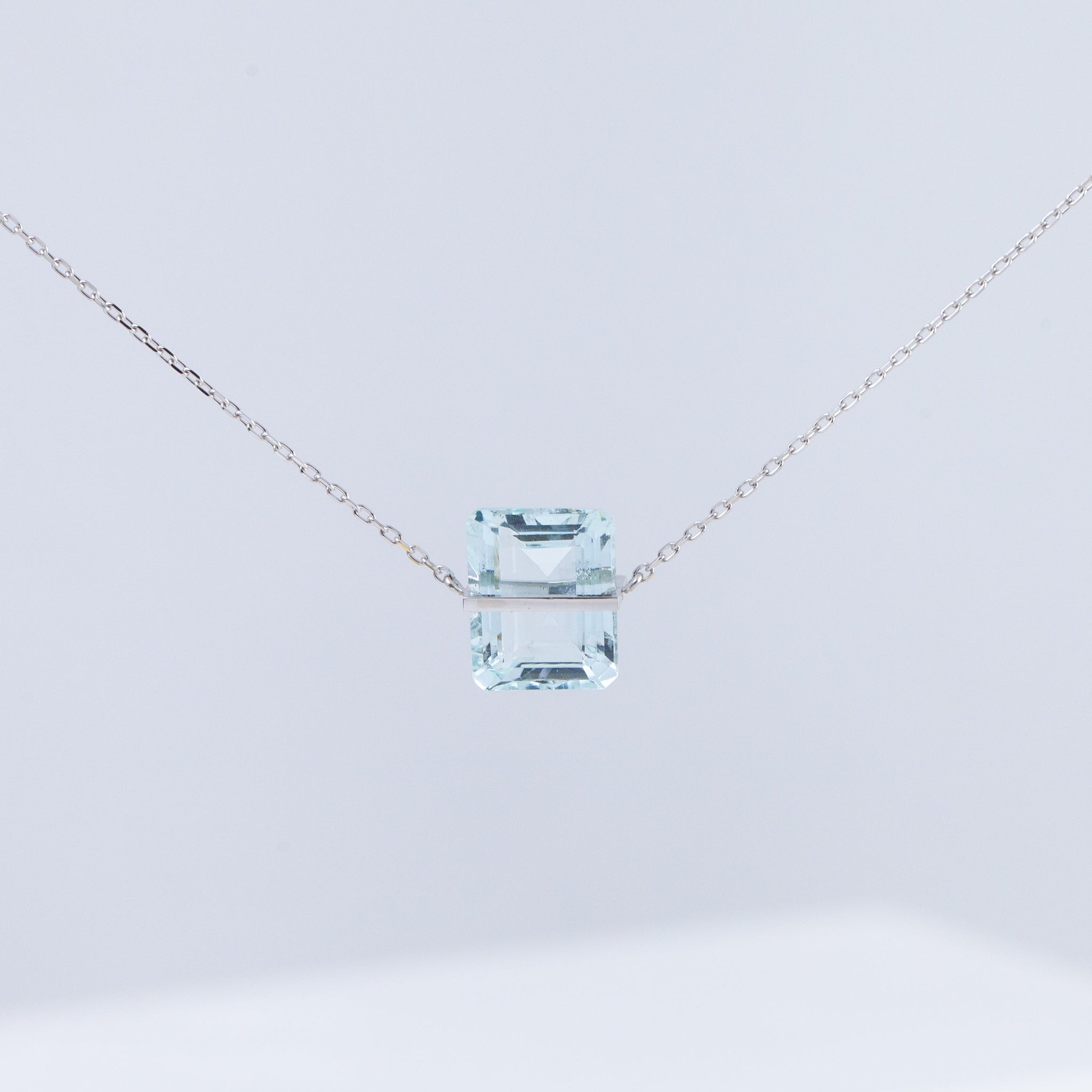 Platinum rectangular aquamarine necklace, set in Januka's proprietary band setting. One-of-a-kind in shape and color. This necklace has a silicon adjuster at the back which allows you to shorten it to the length you desire to fit your look of the day.