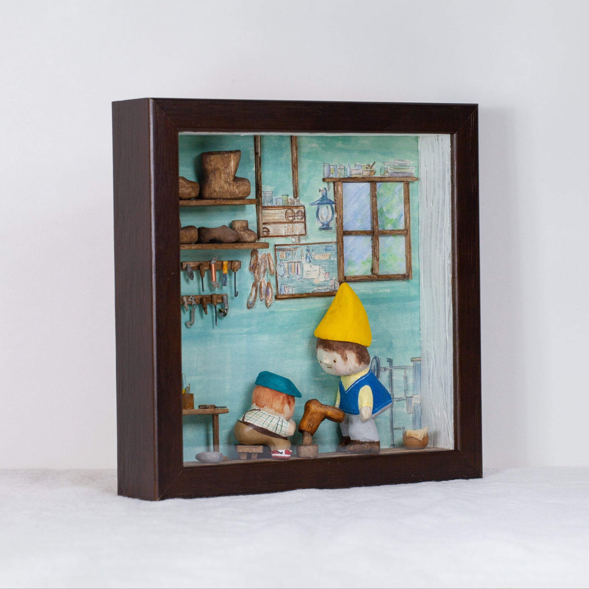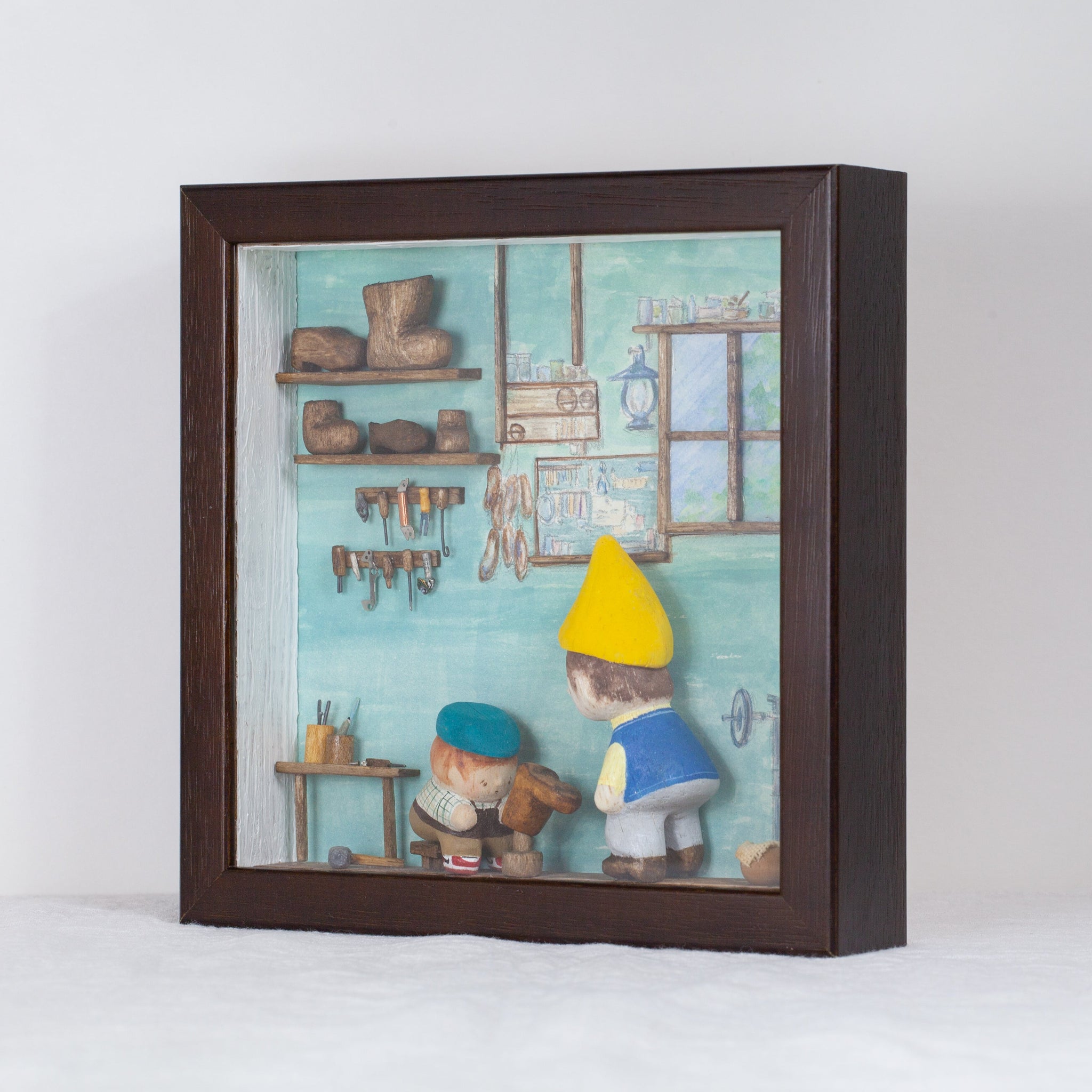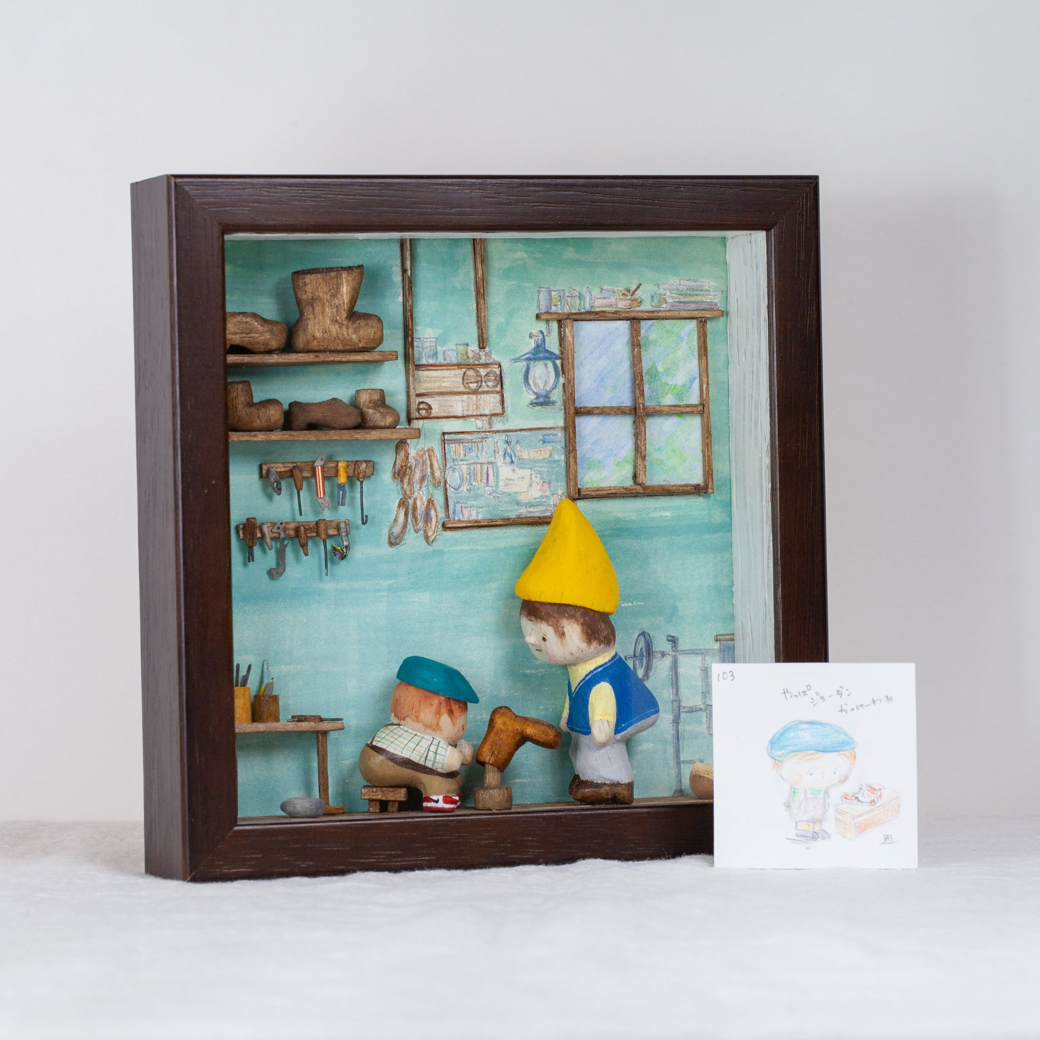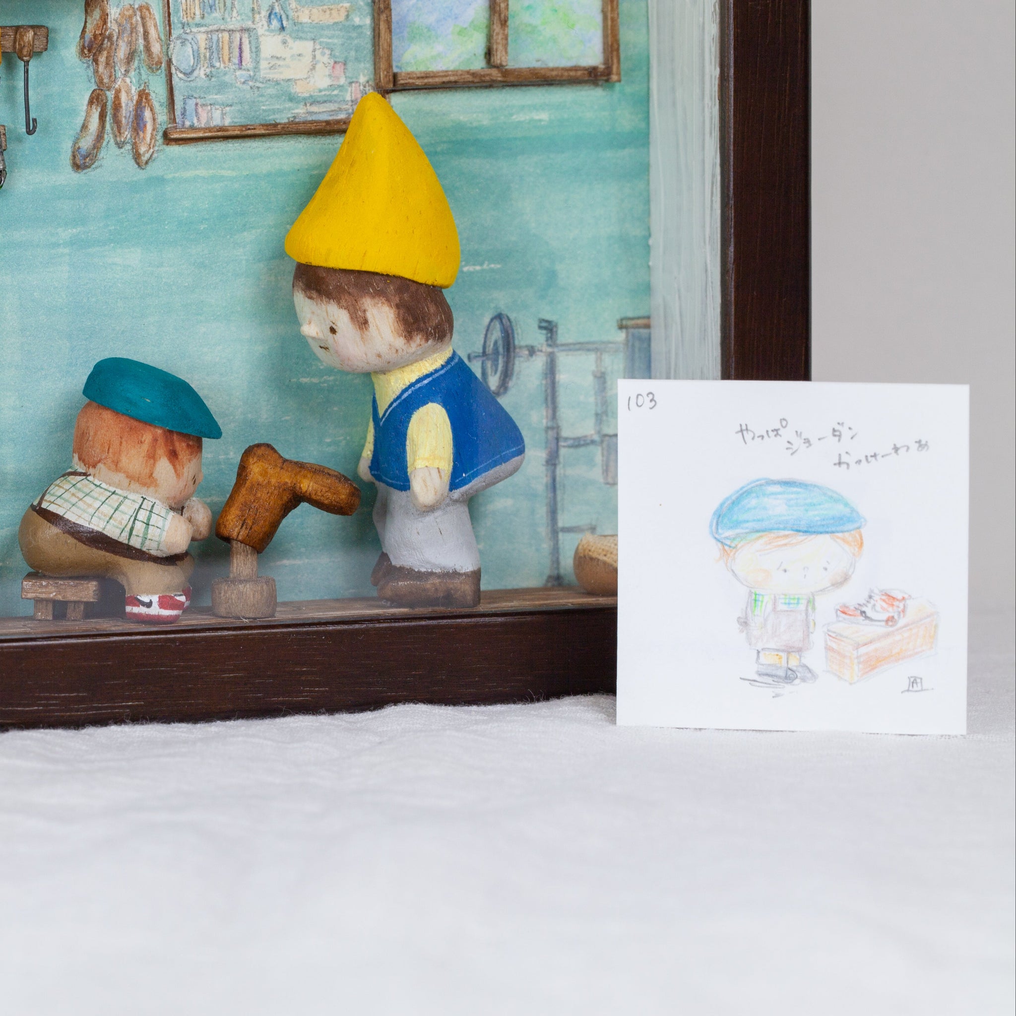 Akaiboushinoki’s carvings often feature tiny characters who always look just a little bit concerned. Each one is hand carved, hand painted, and completely one-of-a-kind. But it is not just the carvings that make Akaiboushinoki’s work special. The playful titles and little after stories, illustrated scenes that come with each piece, feel like quiet whispers from the figurines themselves and have become a signature part of Akaiboushinoki’s world.
