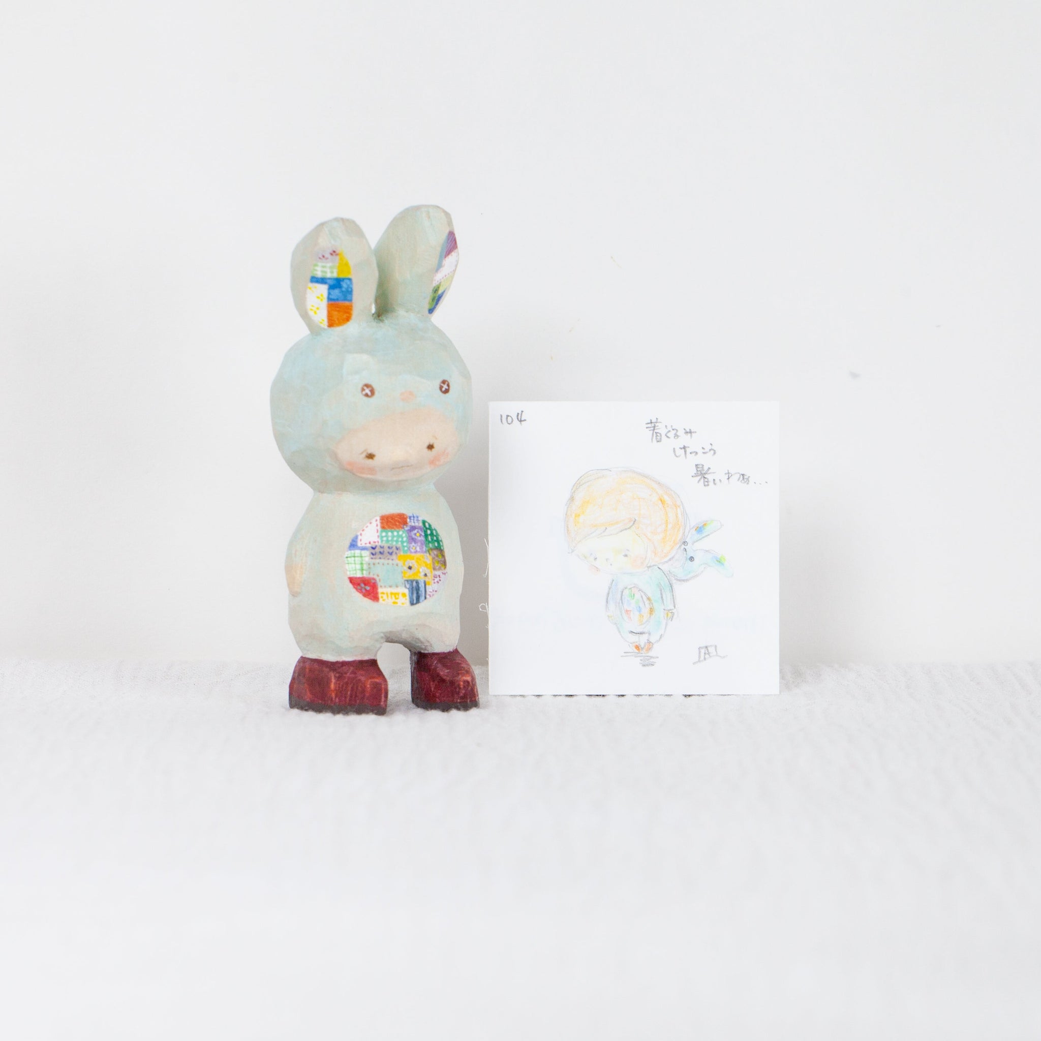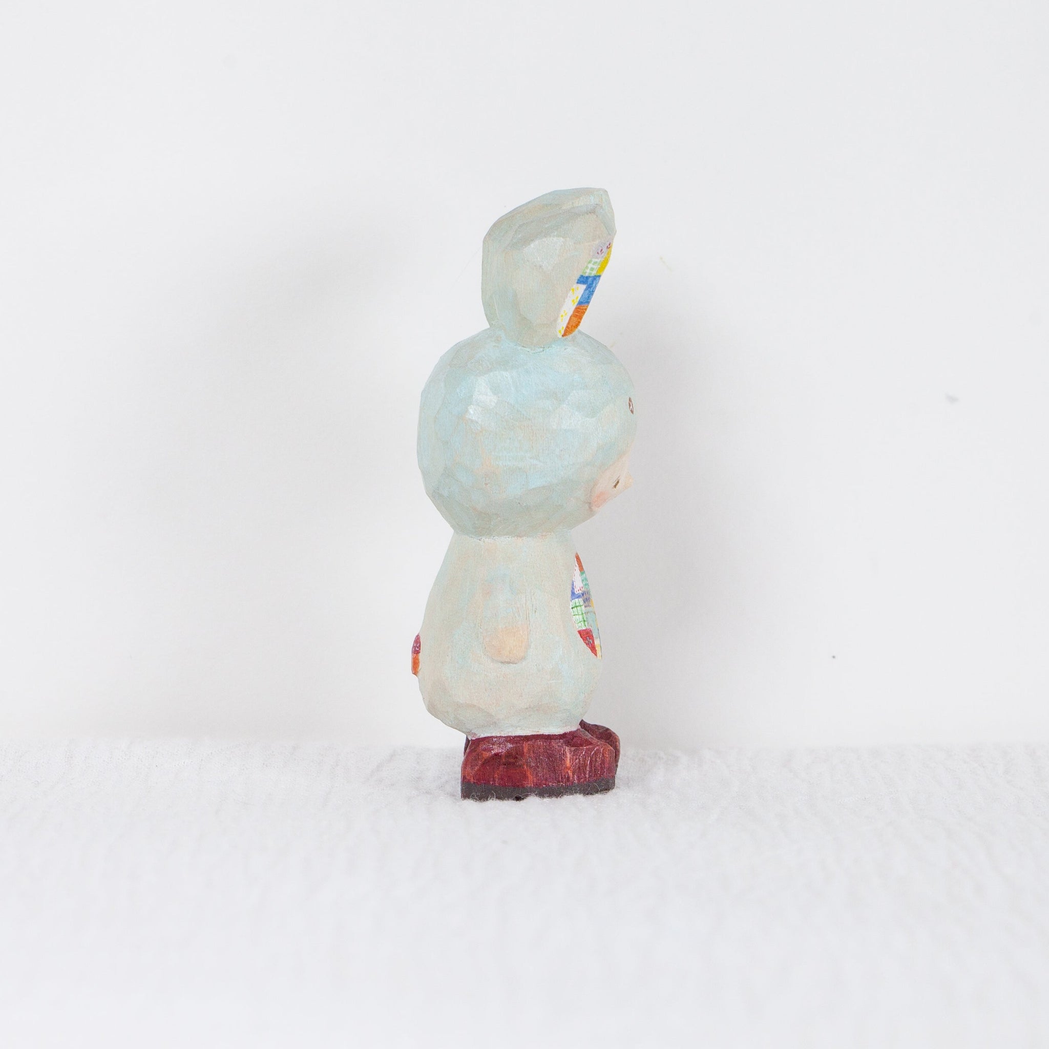 Akaiboushinoki’s carvings often feature tiny characters who always look just a little bit concerned. Each one is hand carved, hand painted, and completely one-of-a-kind. But it is not just the carvings that make Akaiboushinoki’s work special. The playful titles and little after stories, illustrated scenes that come with each piece, feel like quiet whispers from the figurines themselves and have become a signature part of Akaiboushinoki’s world.