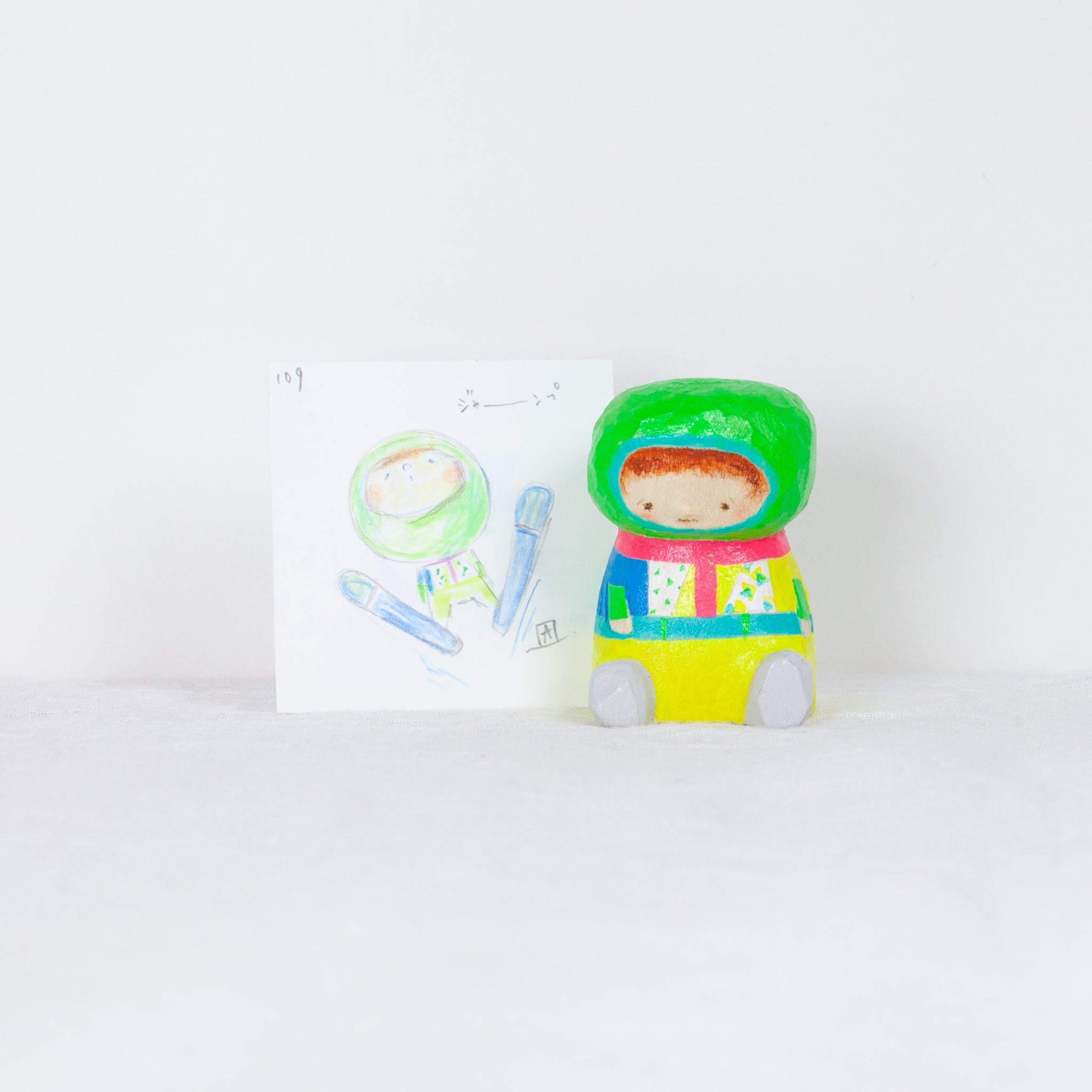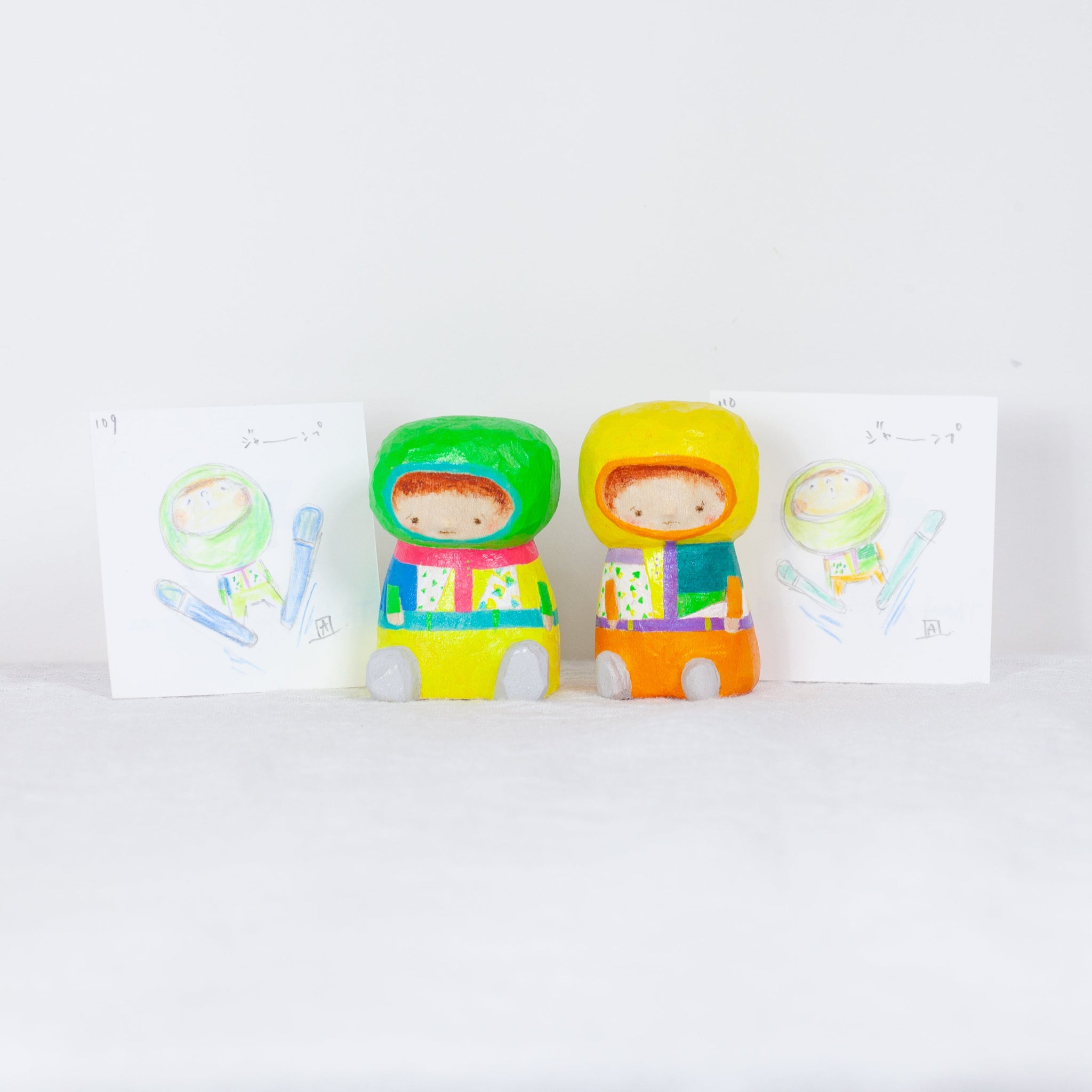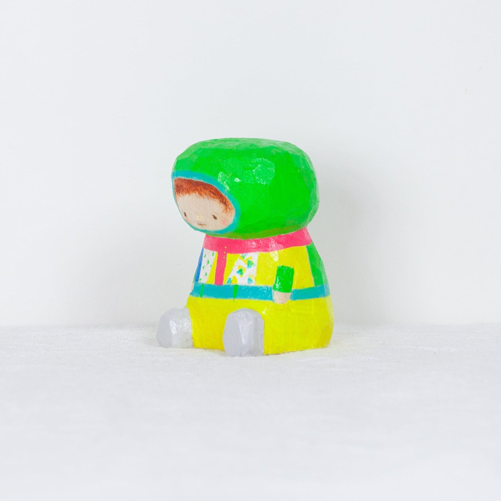 Akaiboushinoki’s carvings often feature tiny characters who always look just a little bit concerned. Each one is hand carved, hand painted, and completely one-of-a-kind. But it is not just the carvings that make Akaiboushinoki’s work special. The playful titles and little after stories, illustrated scenes that come with each piece, feel like quiet whispers from the figurines themselves and have become a signature part of Akaiboushinoki’s world.