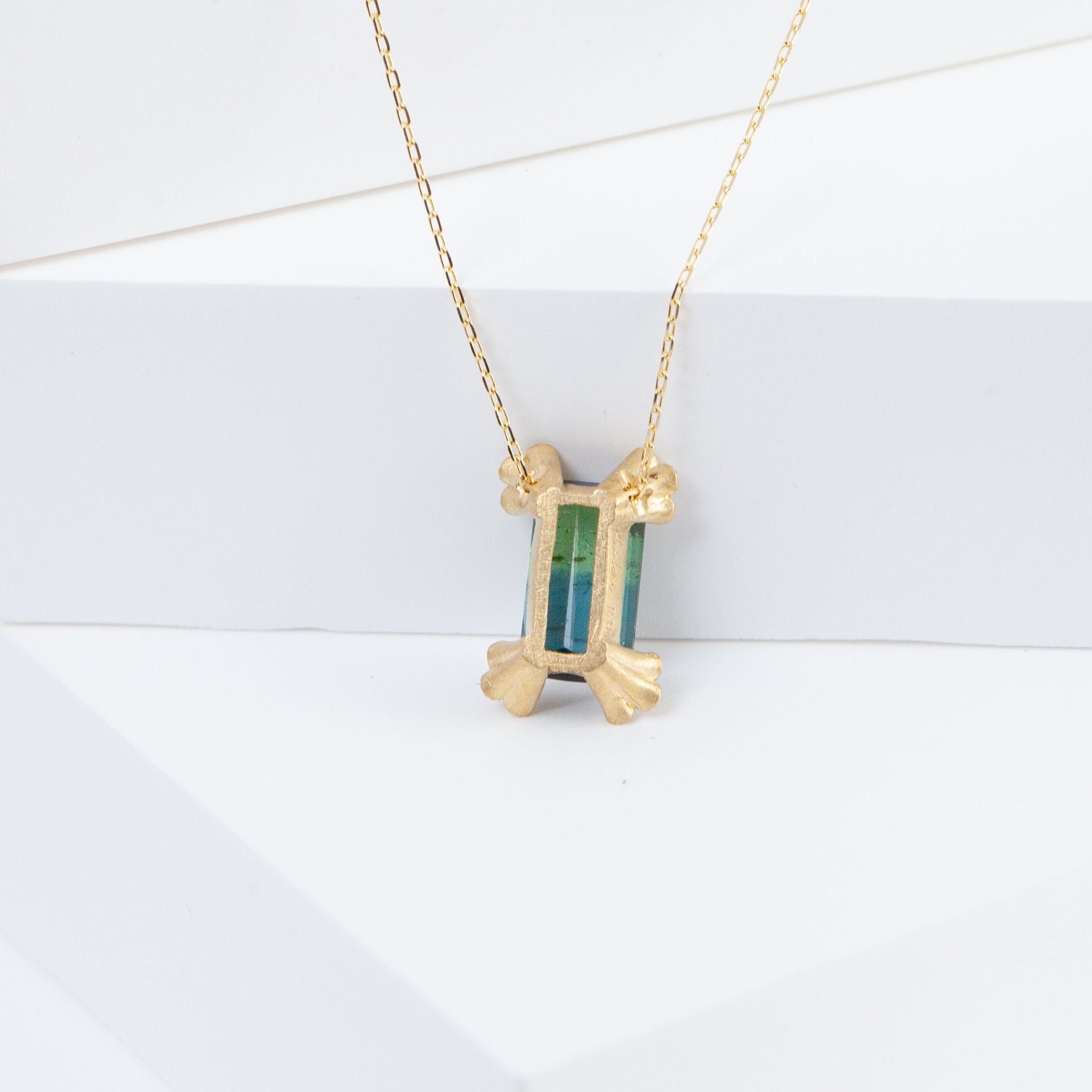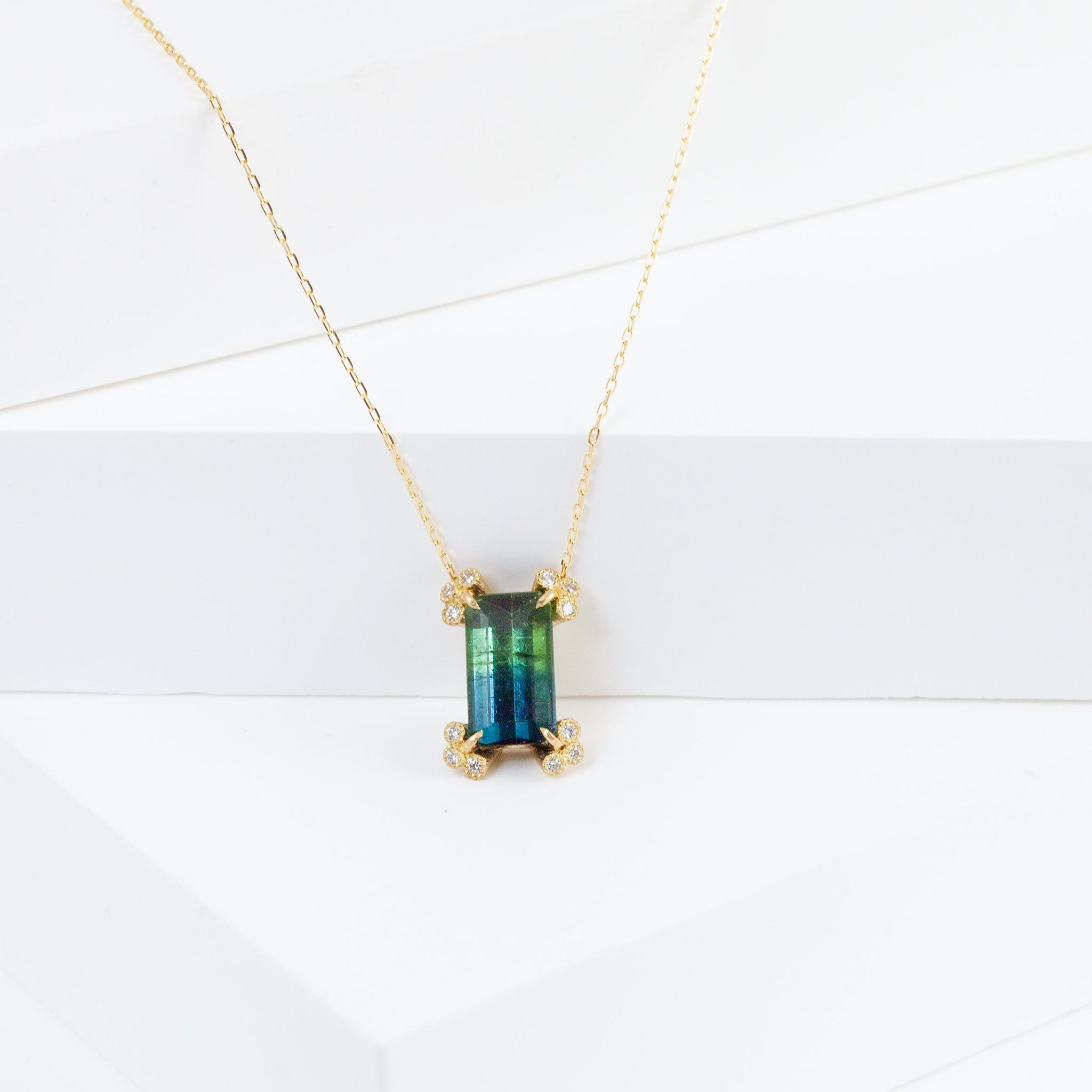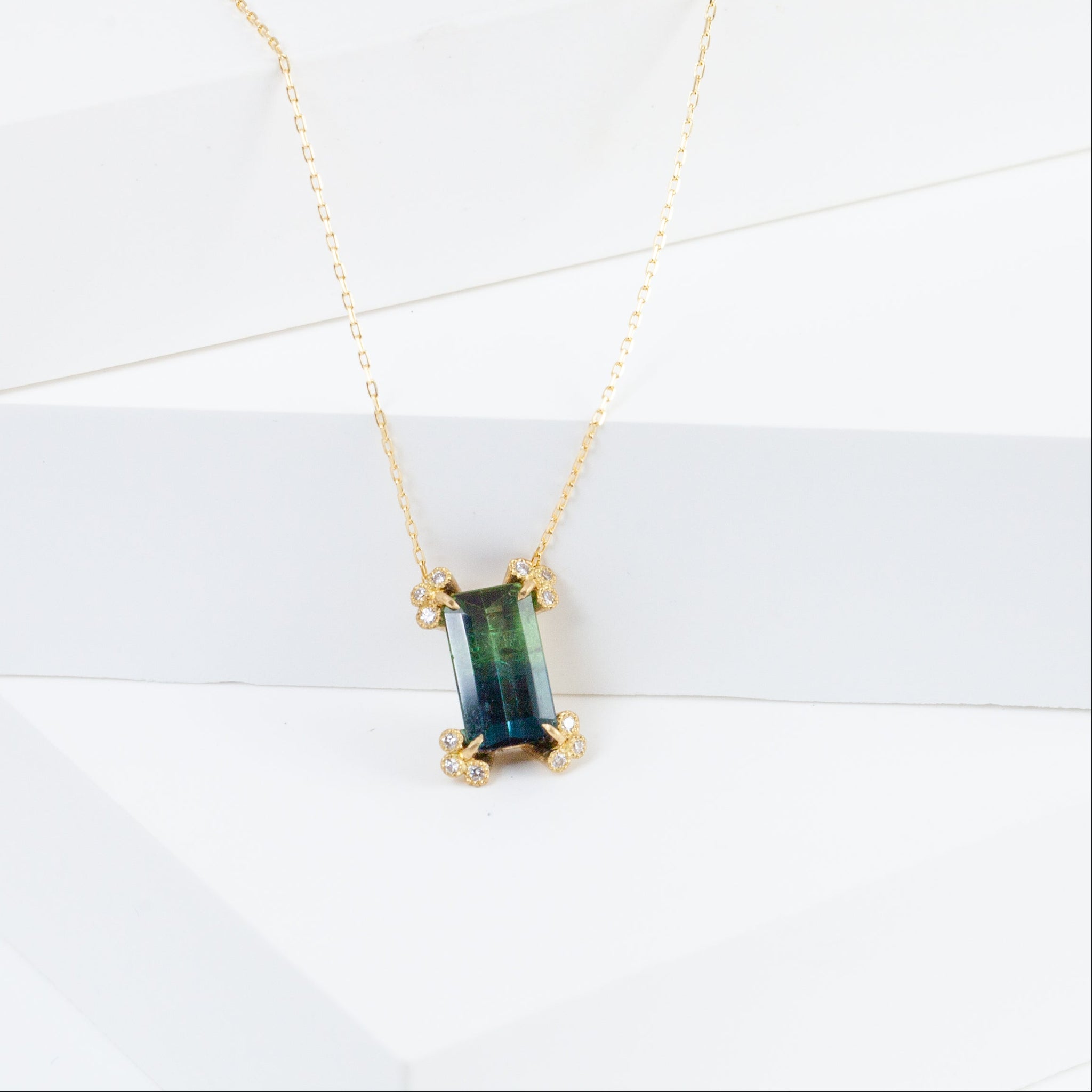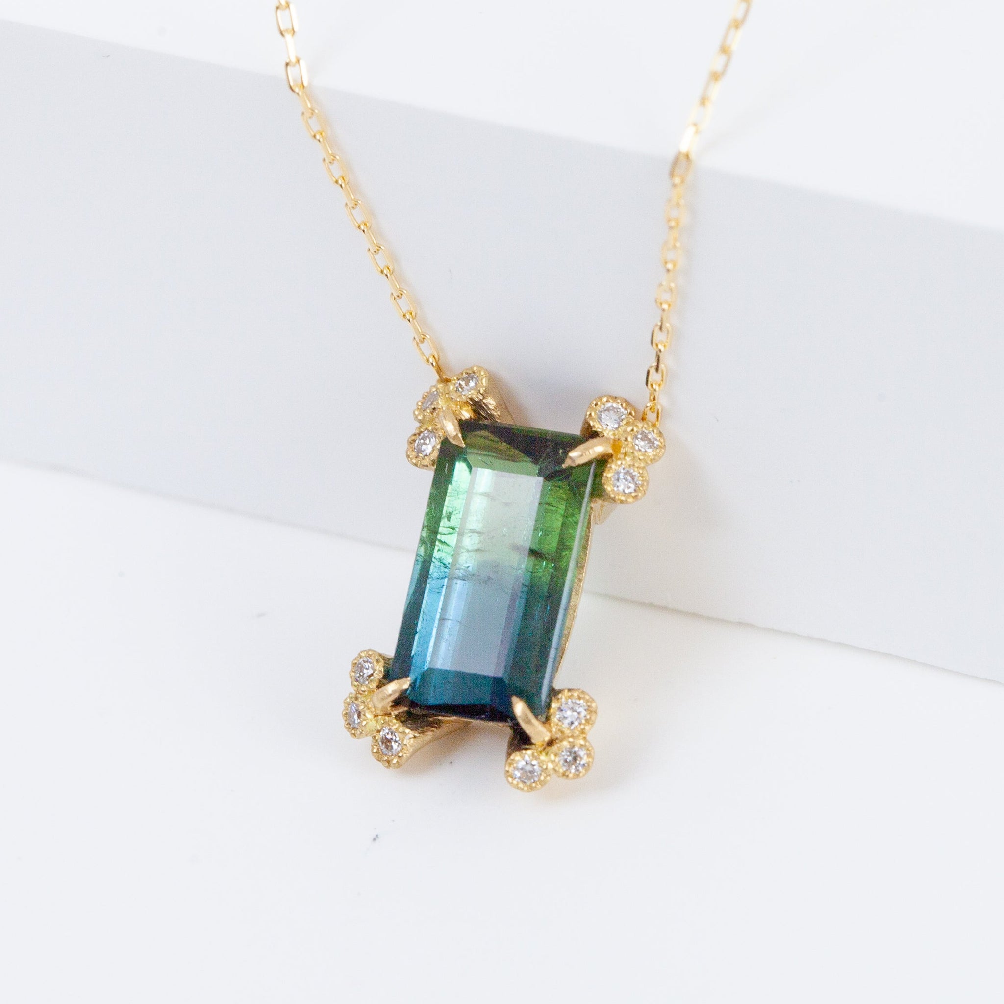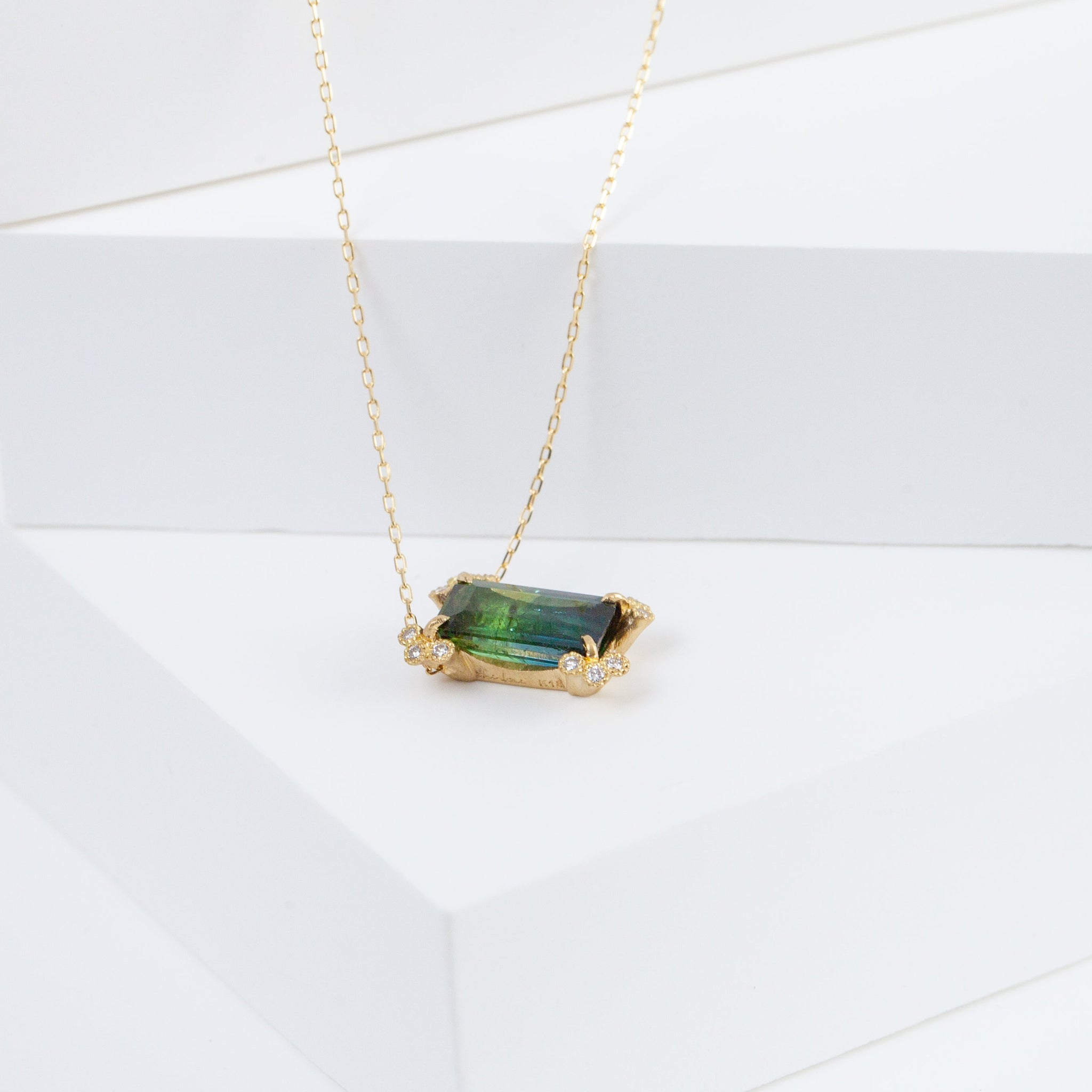 This 18k yellow gold one-of-a-kind spread necklace includes a green tourmaline center stone and 0.03 ct of diamonds. The tactfully applied milgrain surrounding the diamonds is a great representation of Shinkai's true delicate craftsmanship. This green tourmaline shimmers in two tones, a rich forest green and a fresh, lively light green, evoking the beauty of a sunlit garden in full bloom.