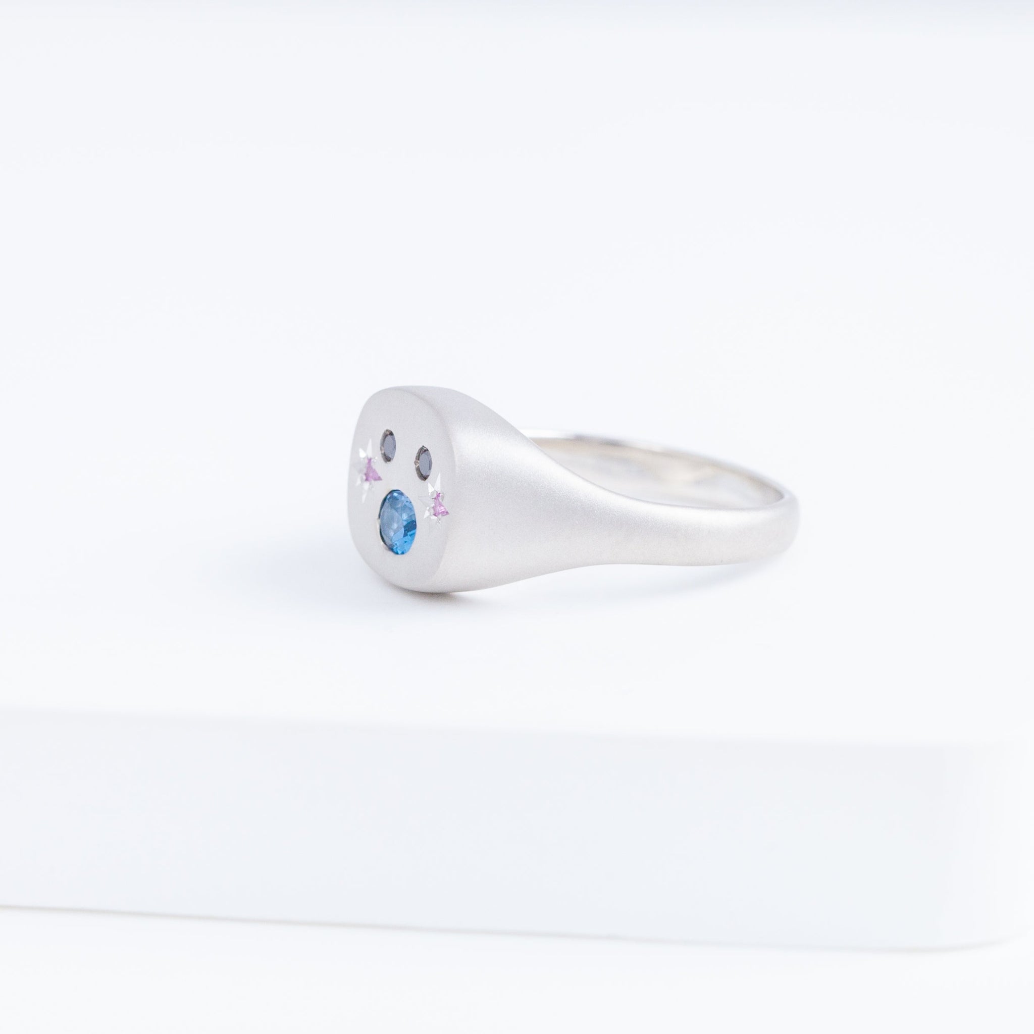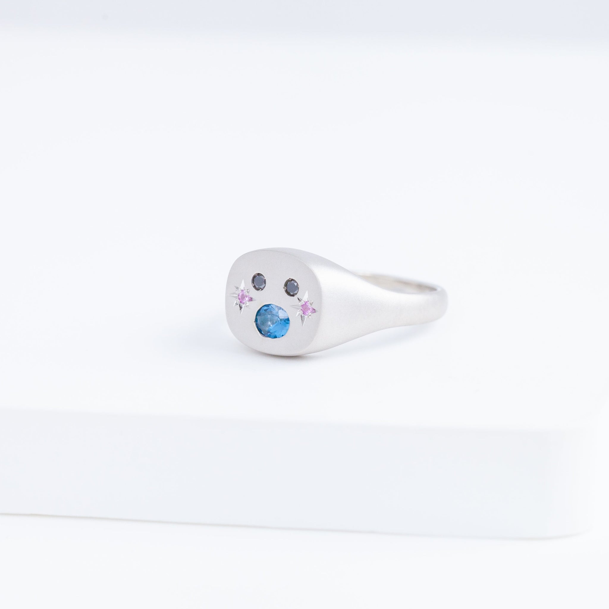 Rhodium plated silver ring with black diamonds as its eyes, pink sapphire set inside star engraving as the cheeks and a blue topaz as its mouth. This ring literally lets you bring the cutest face wherever you go. Who said fine jewelry cannot be fun?