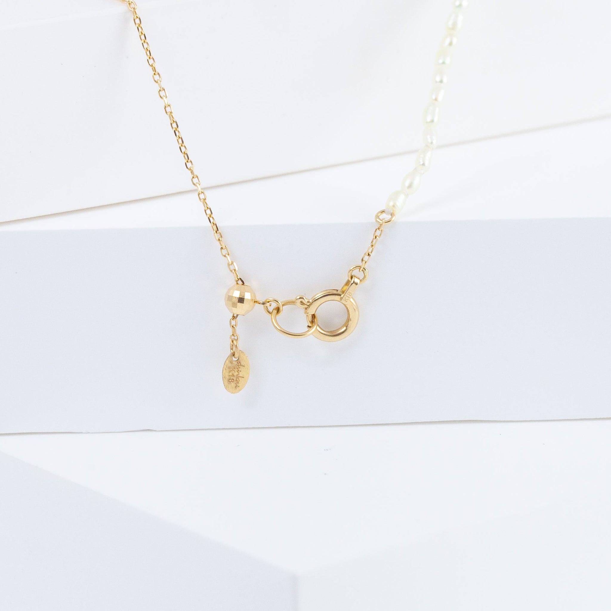 One-of-a-kind small cream colored Akoya pearl necklace with 18K yellow gold hardware. The necklace has a slider clasp for you to adjust the length easily without any compromising on its design. Each Akoya pearl is unique in shape and color, making each necklace one-of-a-kind. This extremely cute yet sophisticatedly made necklace can be worn alone or layered with other necklaces.
