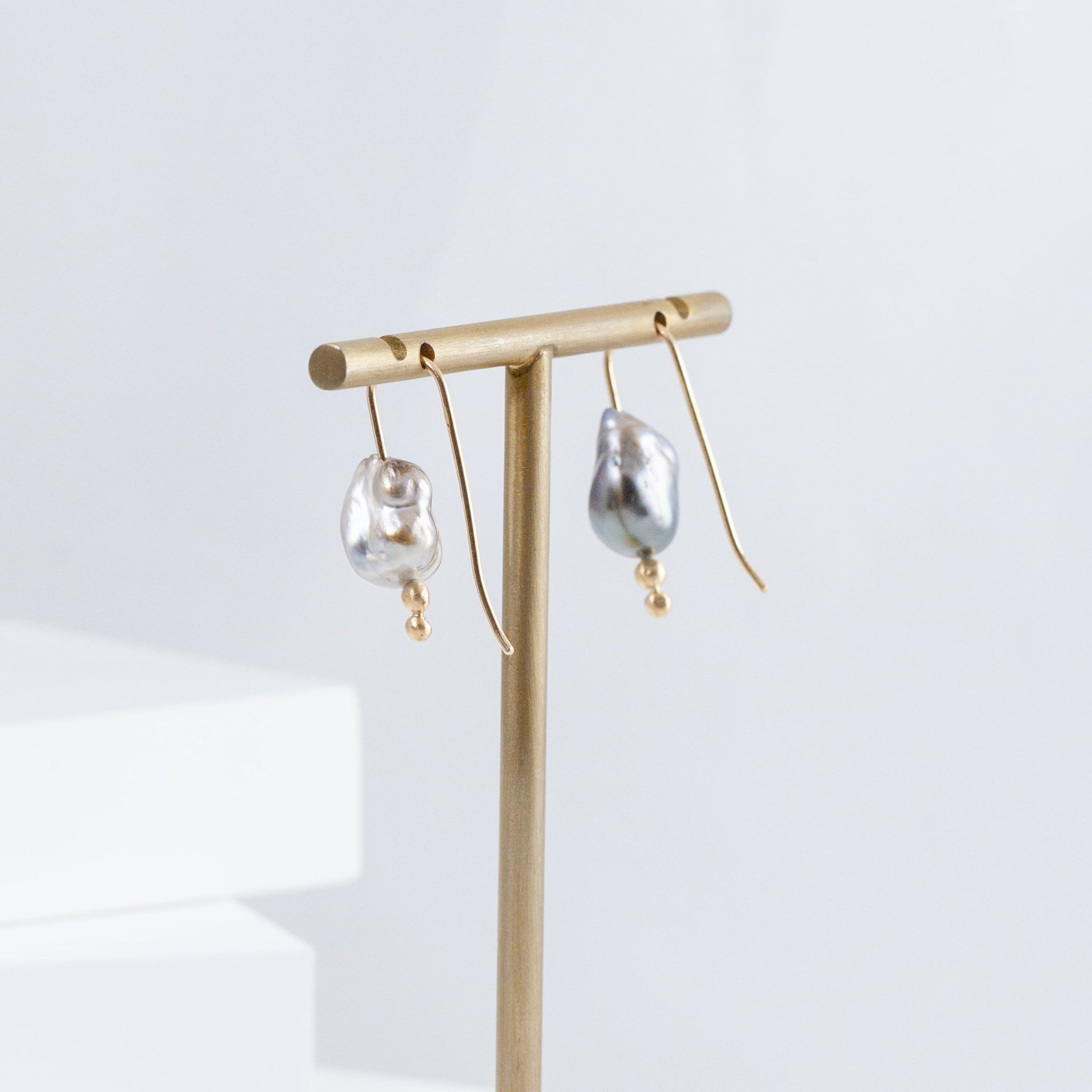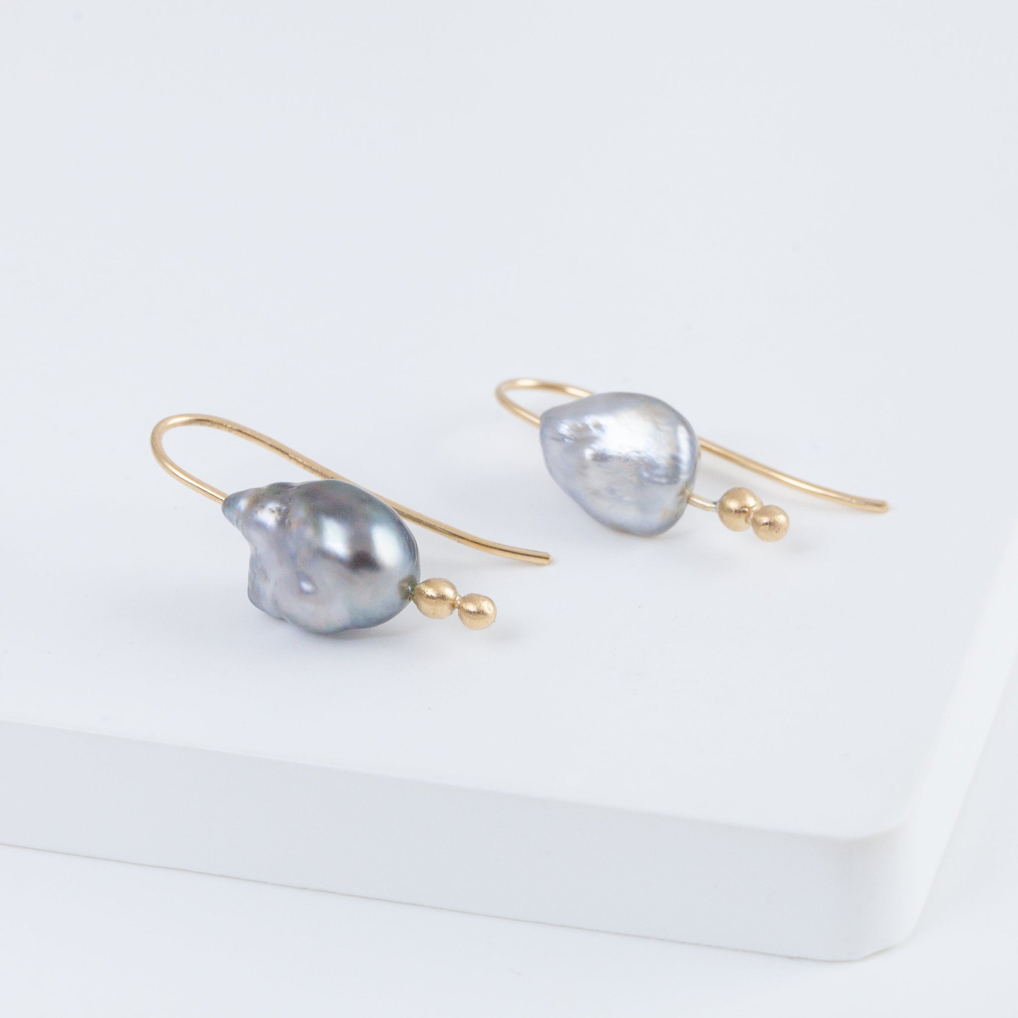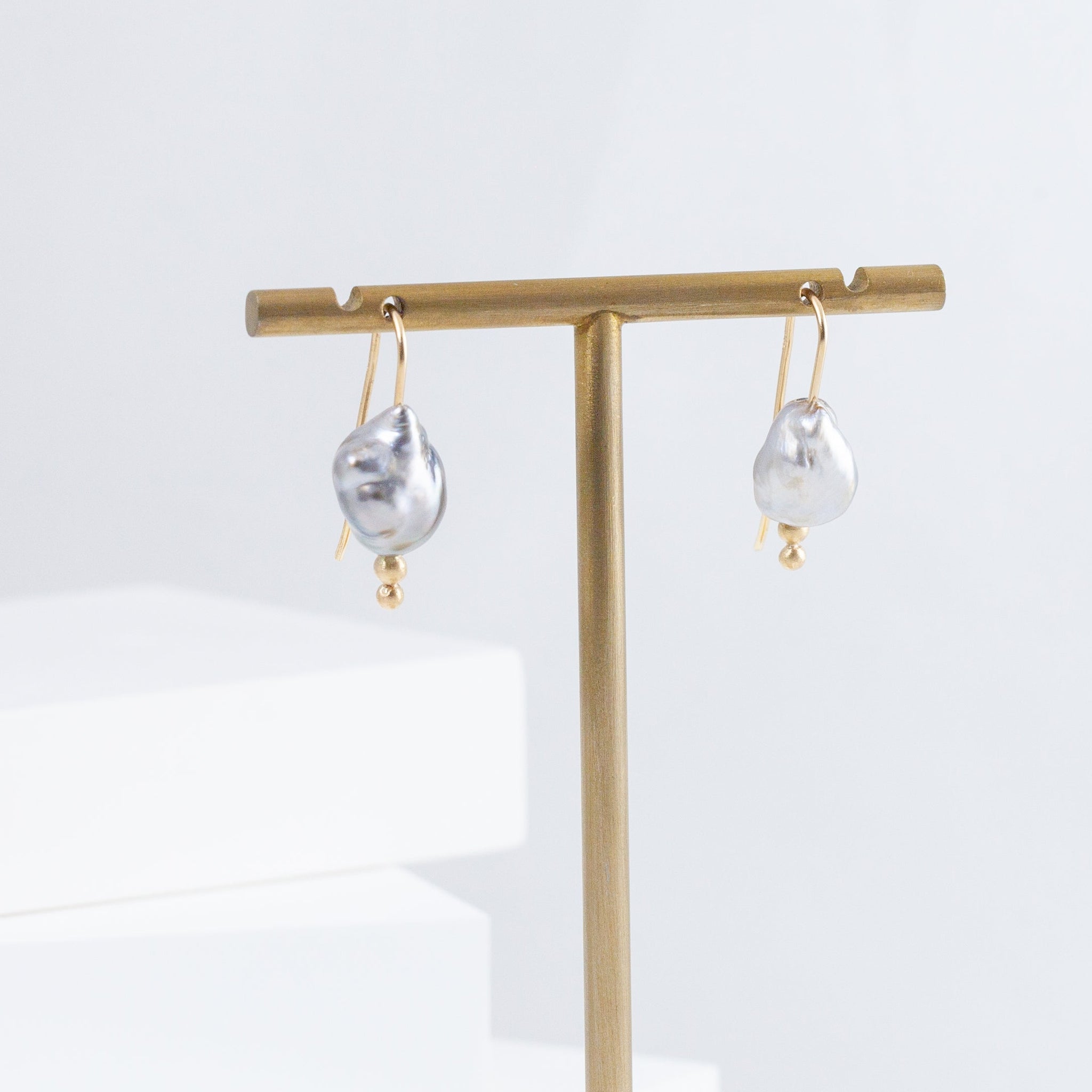 14K yellow gold hook earrings with natural silver keshi pearls. Inspired by the nature, occasionally sweet pieces are often in organic shapes. Each agate is handpicked by the designer on her stone buying trips, as a stone that inspires her.