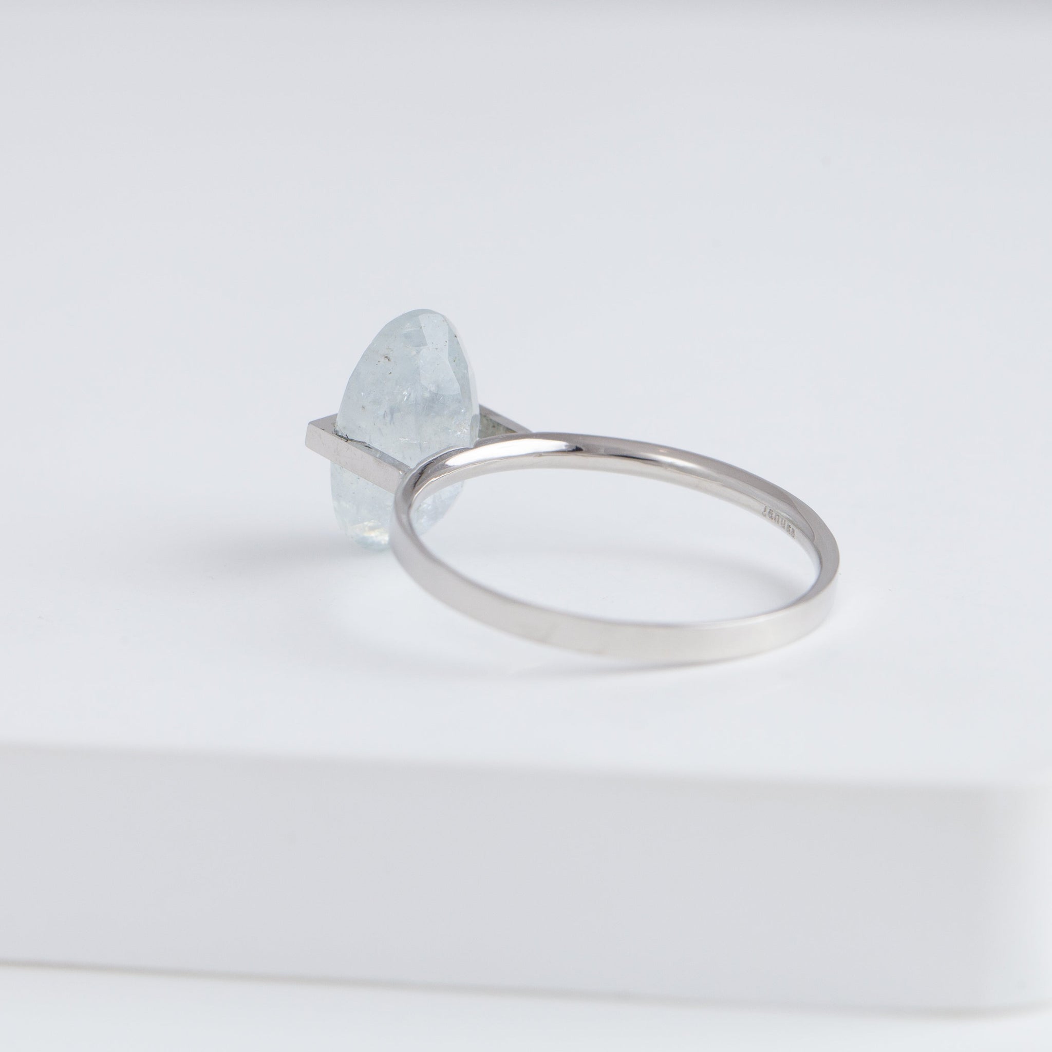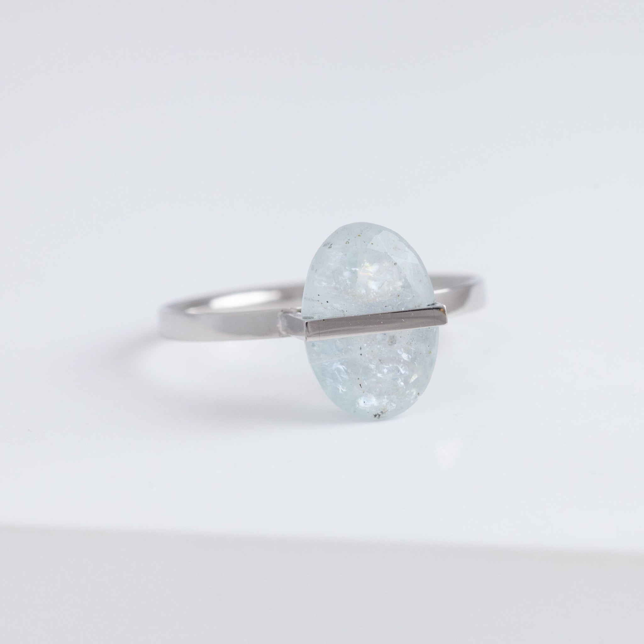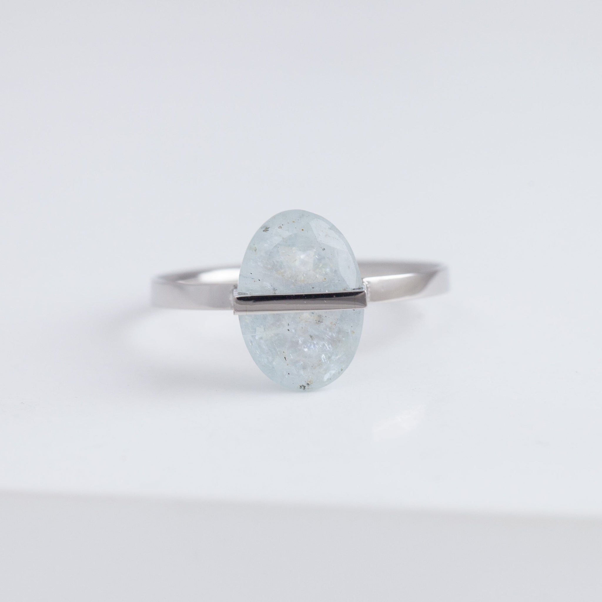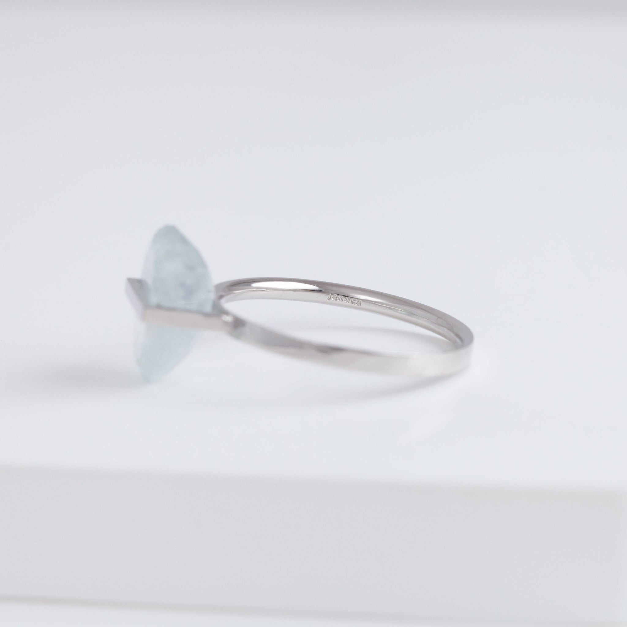 Platinum iridescent aquamarine ring, set in Januka's proprietary band setting. This one-of-a-kind iridescent aquamarine has inclusions which looks as if a whole snow magic kingdom is trapped inside the stone! This ring is chic and simple, but also can adds pops of color to your everyday style.