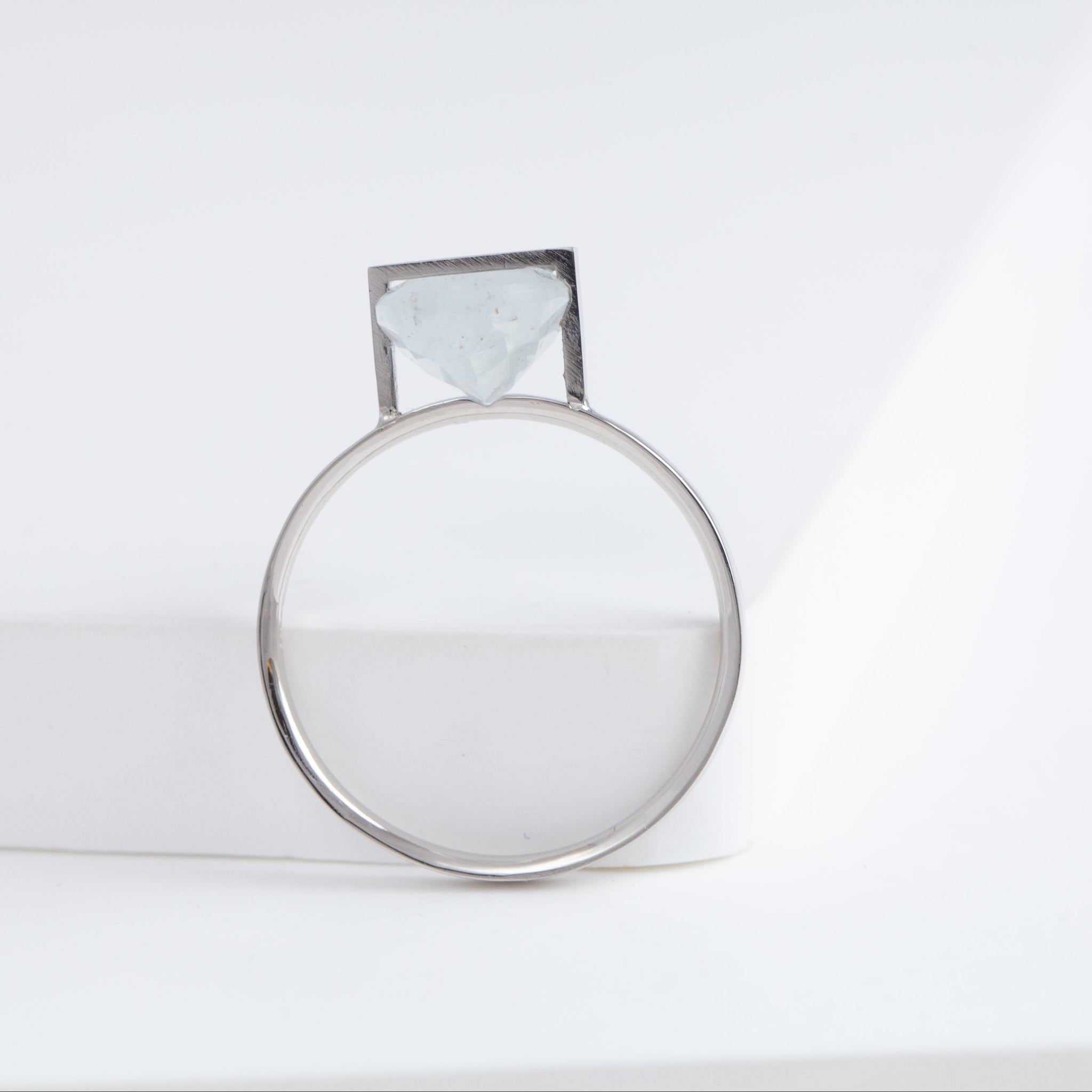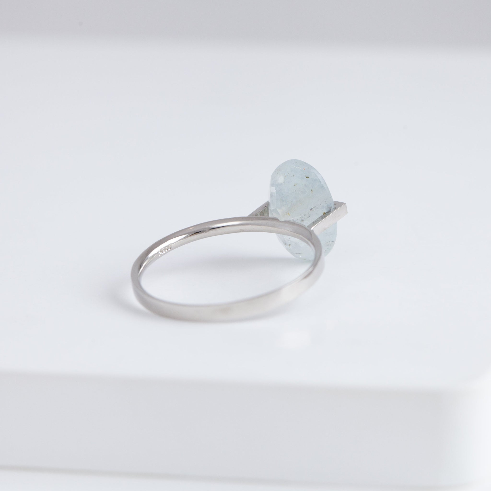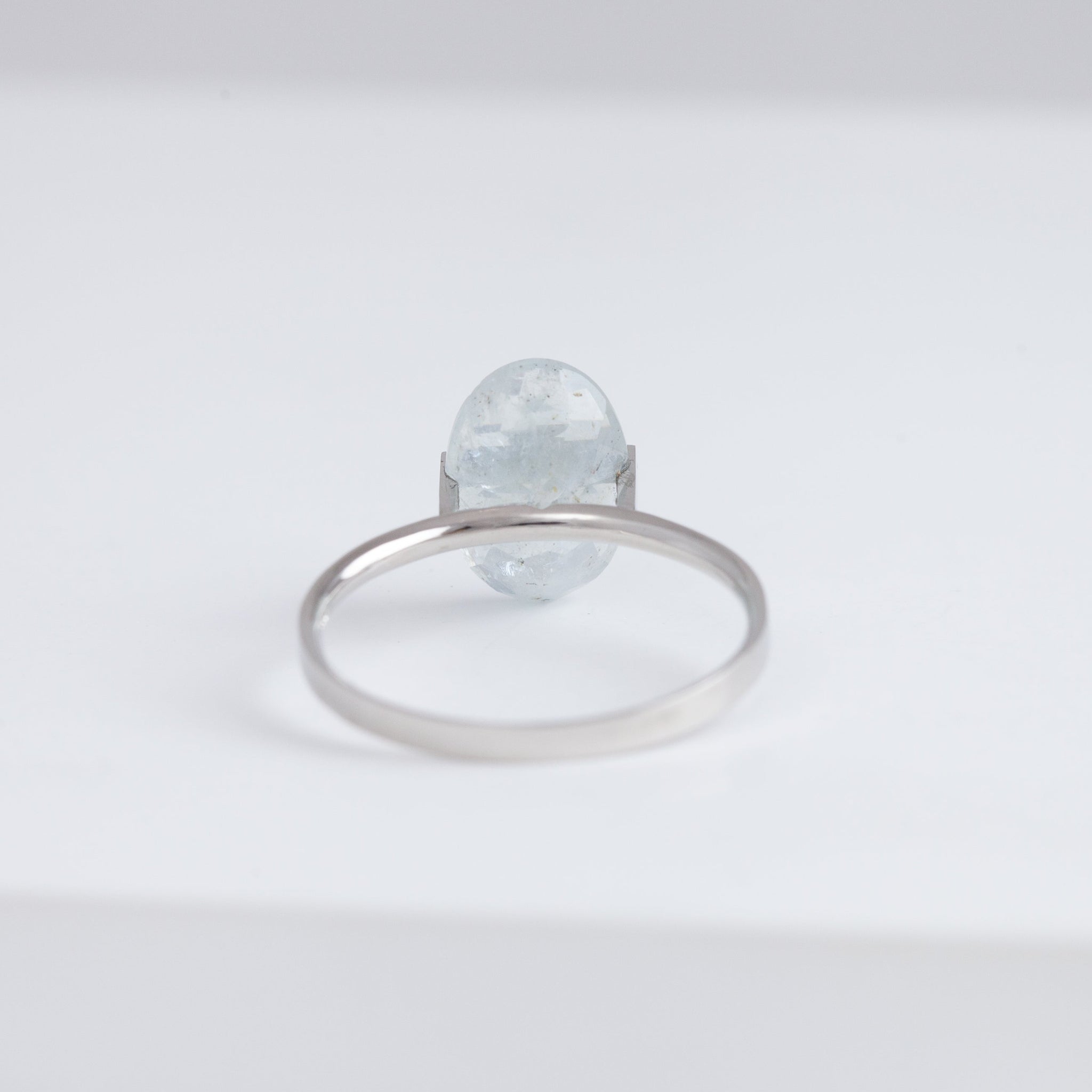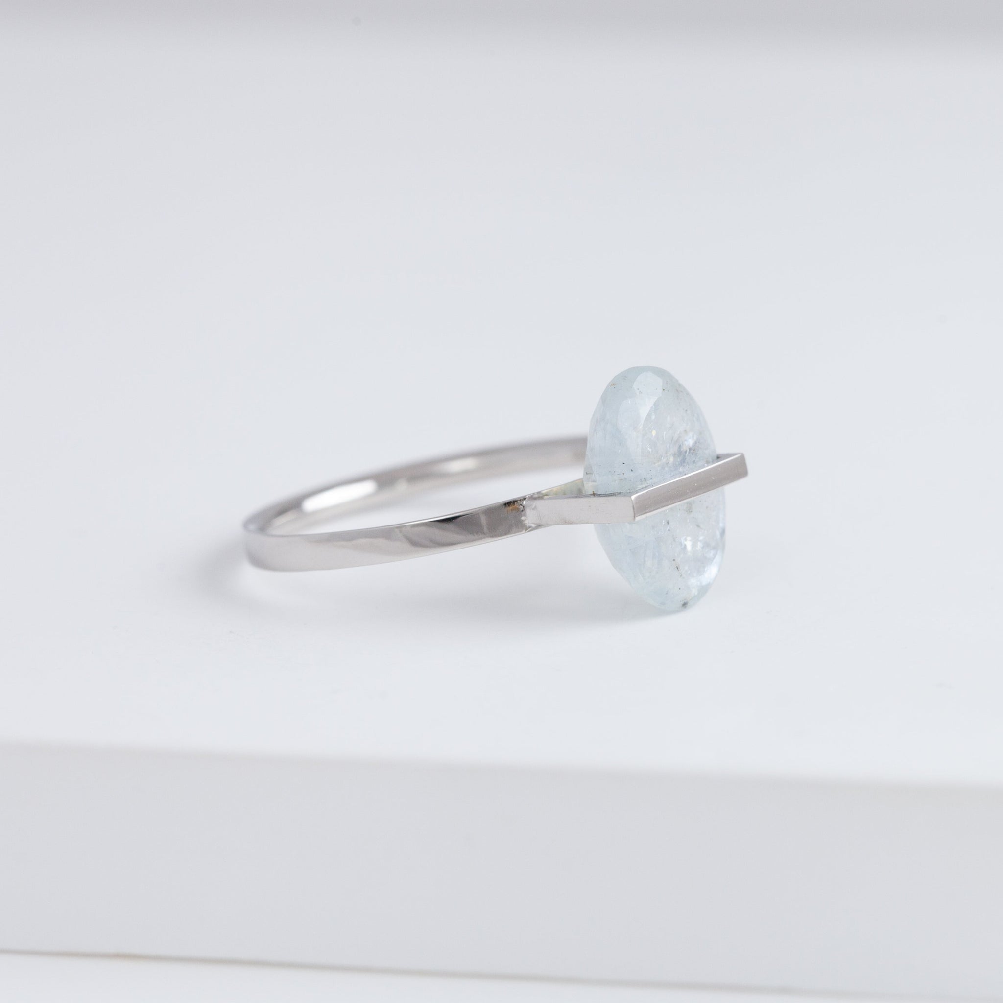 Platinum iridescent aquamarine ring, set in Januka's proprietary band setting. This one-of-a-kind iridescent aquamarine has inclusions which looks as if a whole snow magic kingdom is trapped inside the stone! This ring is chic and simple, but also can adds pops of color to your everyday style.