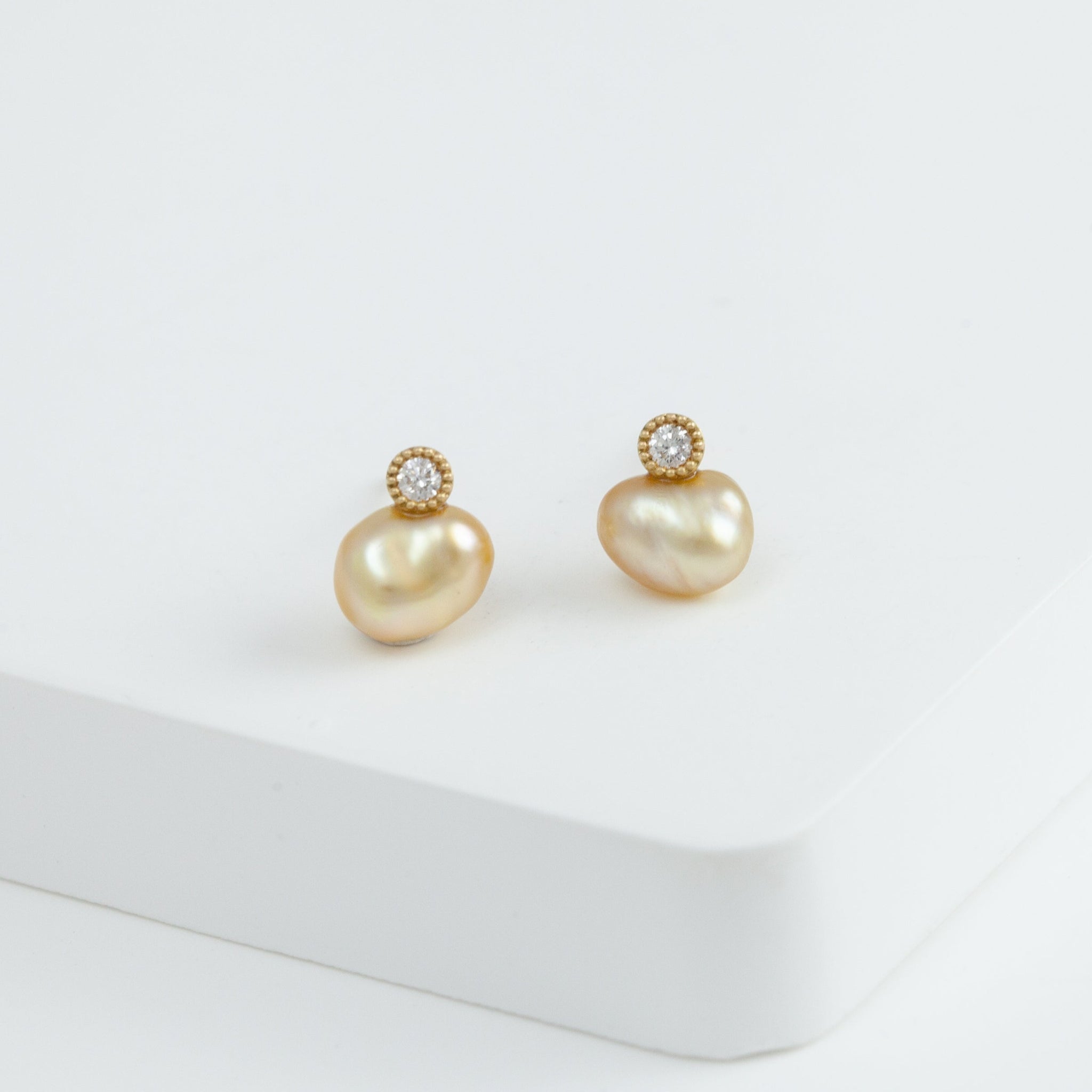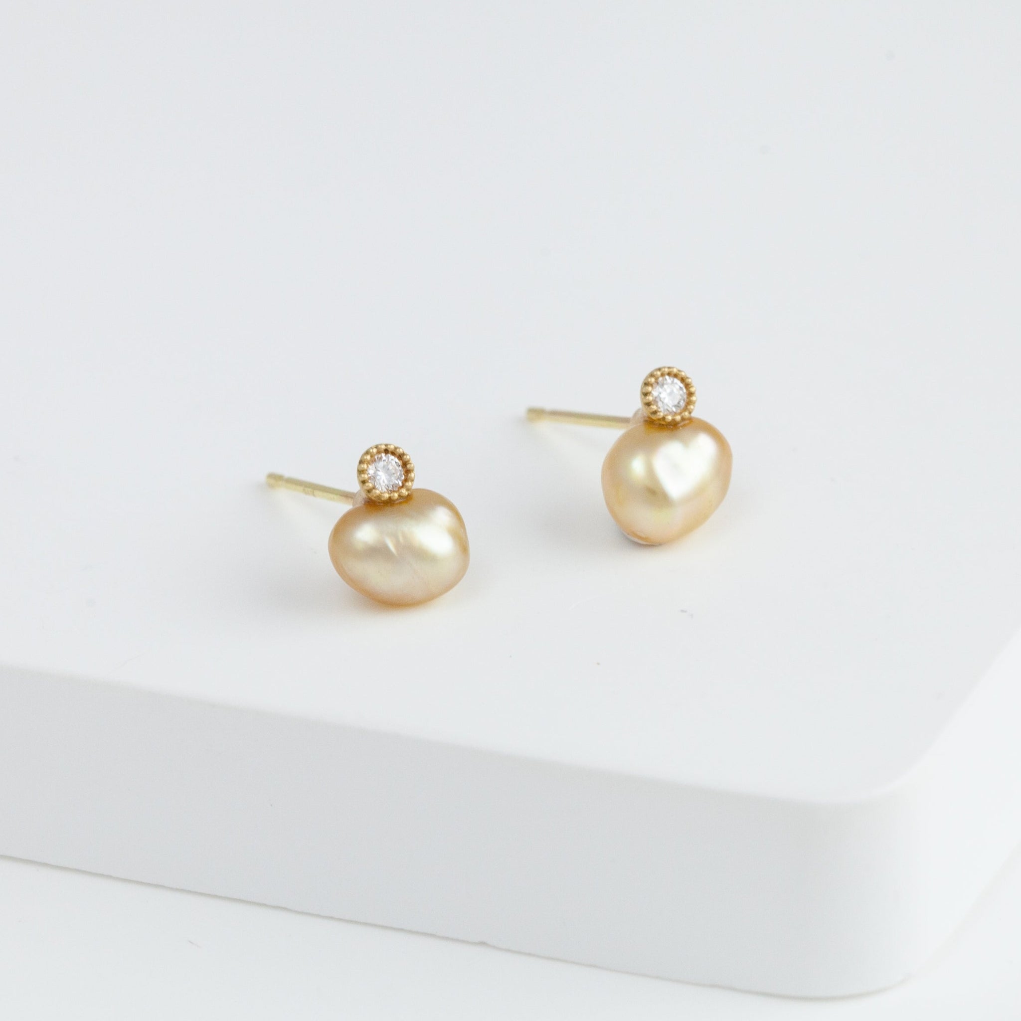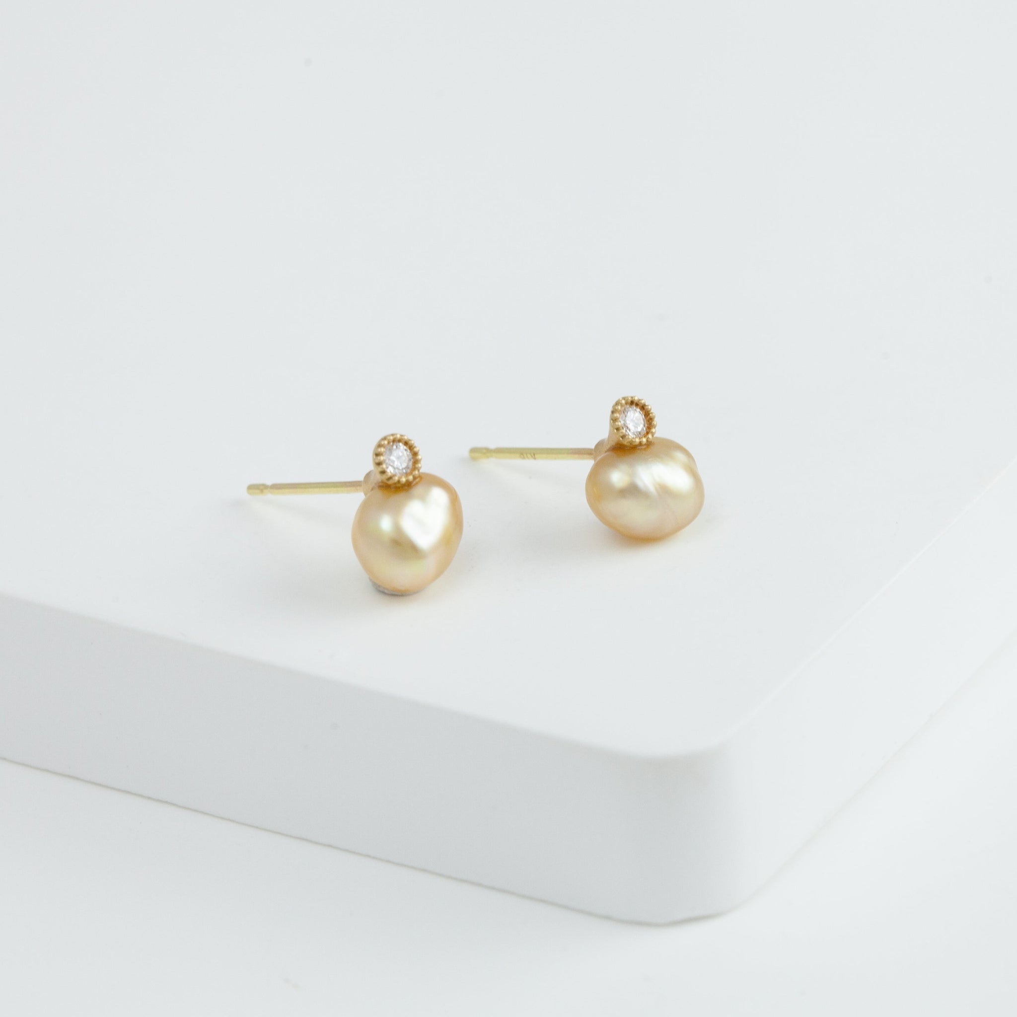 18k yellow gold stud with a baby gold south sea pearl set with a 0.02 ct diamond. Each pearl is unique in shape and colors, making each stud one-of-a-kind. The delicate milgrain surrounding the diamond is tactfully applied by hand. It is a unique alternative to a traditional pearl stud.